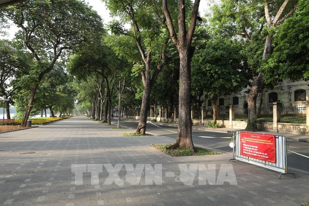Khu vực bờ hồ vắng bóng người qua lại trước giờ đi làm trong ngày đầu thực hiện. Ảnh: Minh Quyết - TTXVN