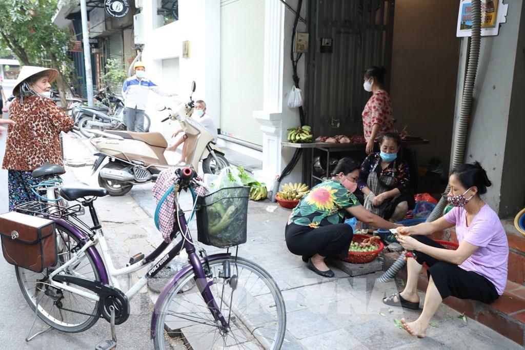 Một số người dân Hà Nội vẫn giữ thói quen đi chợ sáng, không tuân thủ nguyên tắc 5K. Ảnh: Minh Quyết - TTXVN