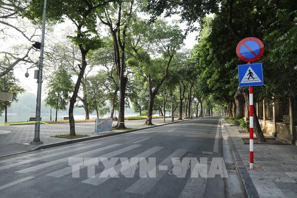 Khu vực Hồ Hoàn Kiếm vắng bóng người qua lại trước giờ đi làm trong ngày đầu thực hiện. Ảnh: Minh Quyết - TTXVN