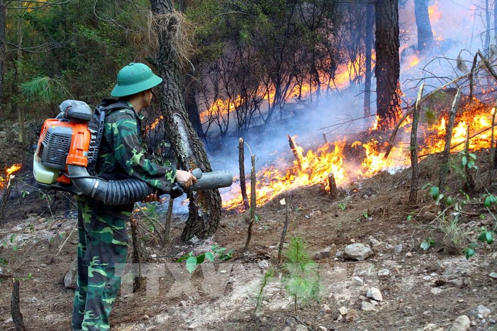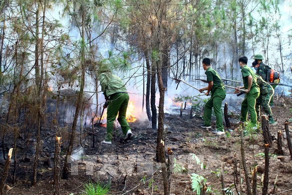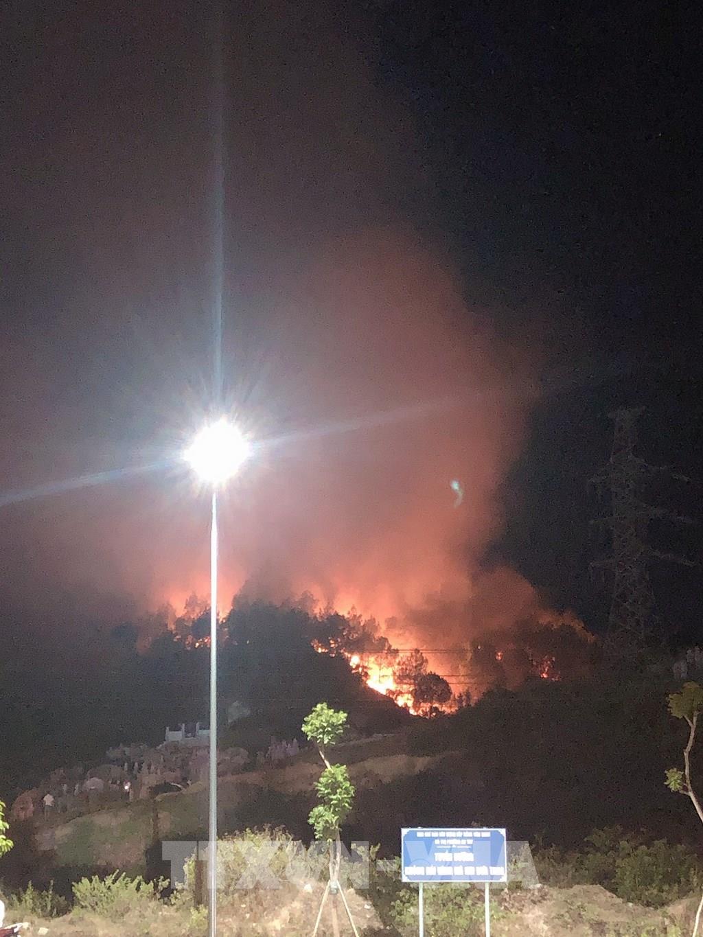 Ngọn lửa bùng phát lớn ở khu rừng thông tại khu vực đồi núi gần Trường Đại học Luật Huế ở phường An Tây, thành phố Huế. Ảnh: Đỗ Trưởng - TTXVN