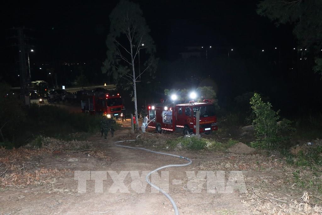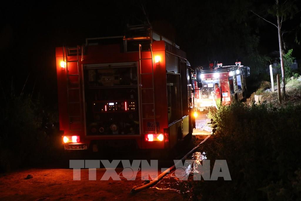 Lực lượng phòng cháy chữa cháy Công an tỉnh Thừa Thiên- Huế huy động xe chữa cháy cùng nhiều cán bộ, chiến sĩ tham gia dập lửa tại khu vực đồi núi gần Trường Đại học Luật Huế ở phường An Tây, thành phố Huế. Ảnh: Đỗ Trưởng - TTXVN