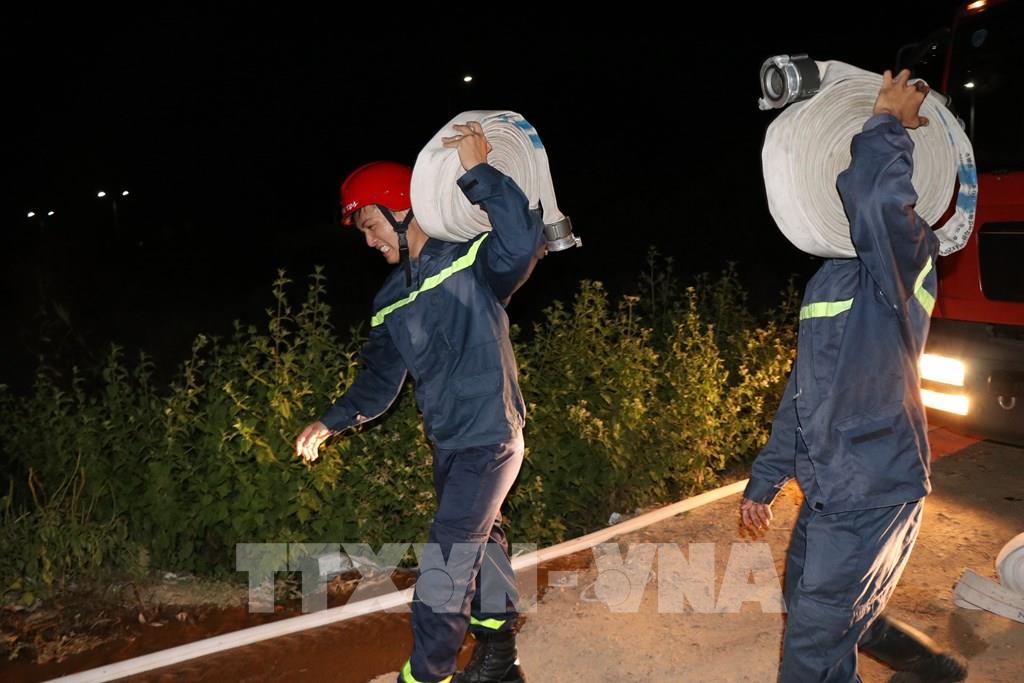 Các lực lượng chức năng nỗ lực dập lửa tại xã Diễn Lợi, huyện Diễn Châu (Nghệ An). Ảnh: Tá Chuyên – TTXVN