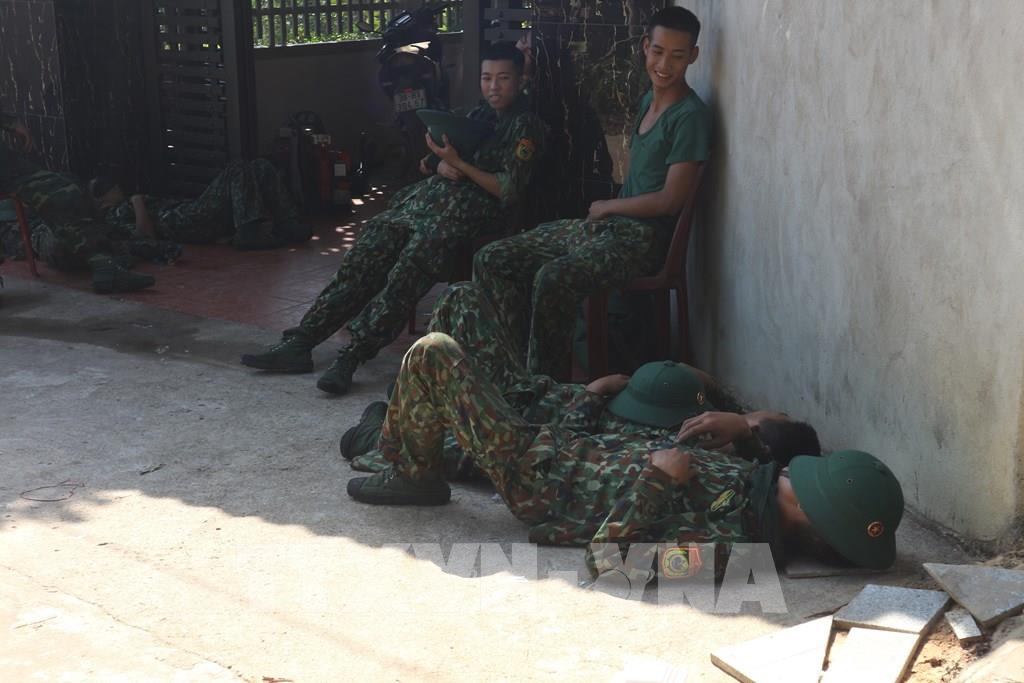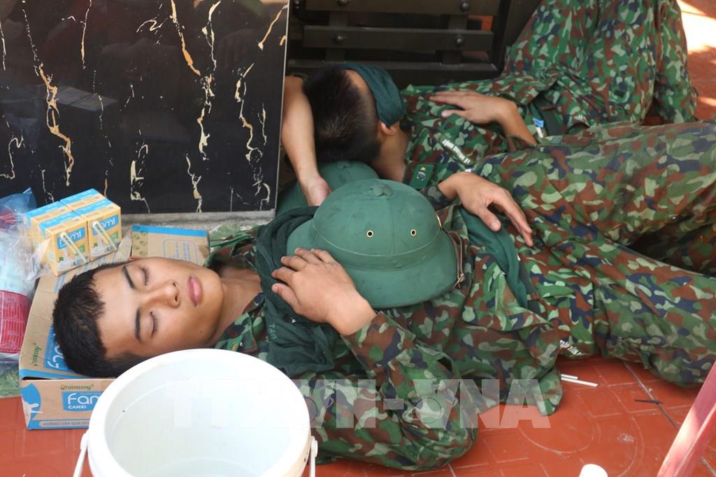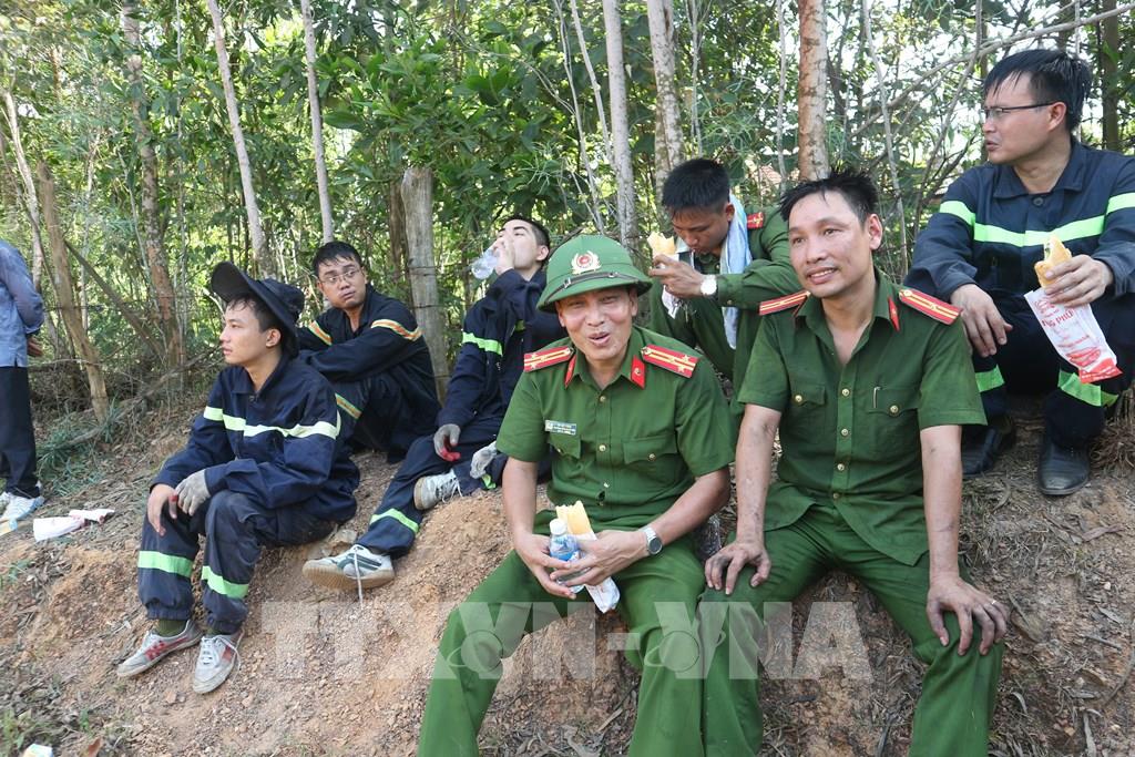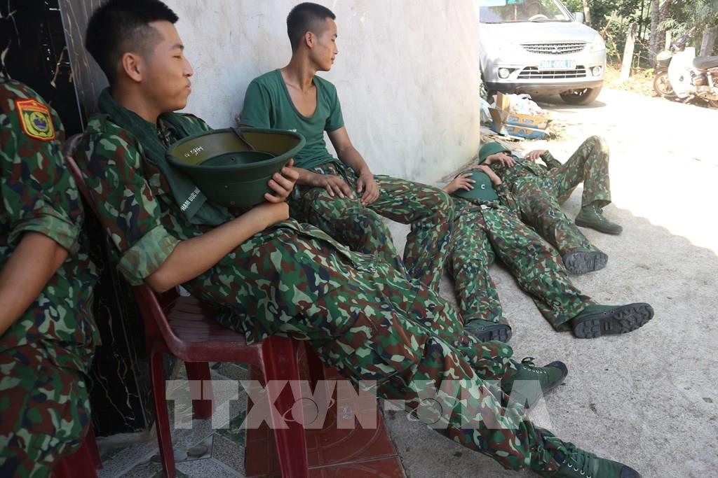 Các cán bộ chiến sỹ tham gia dập lửa nghỉ ngơi sau 48 giờ nỗ lực dập lửa tại huyện Diễn Châu (Nghệ An). Ảnh: Tá Chuyện – TTXVN