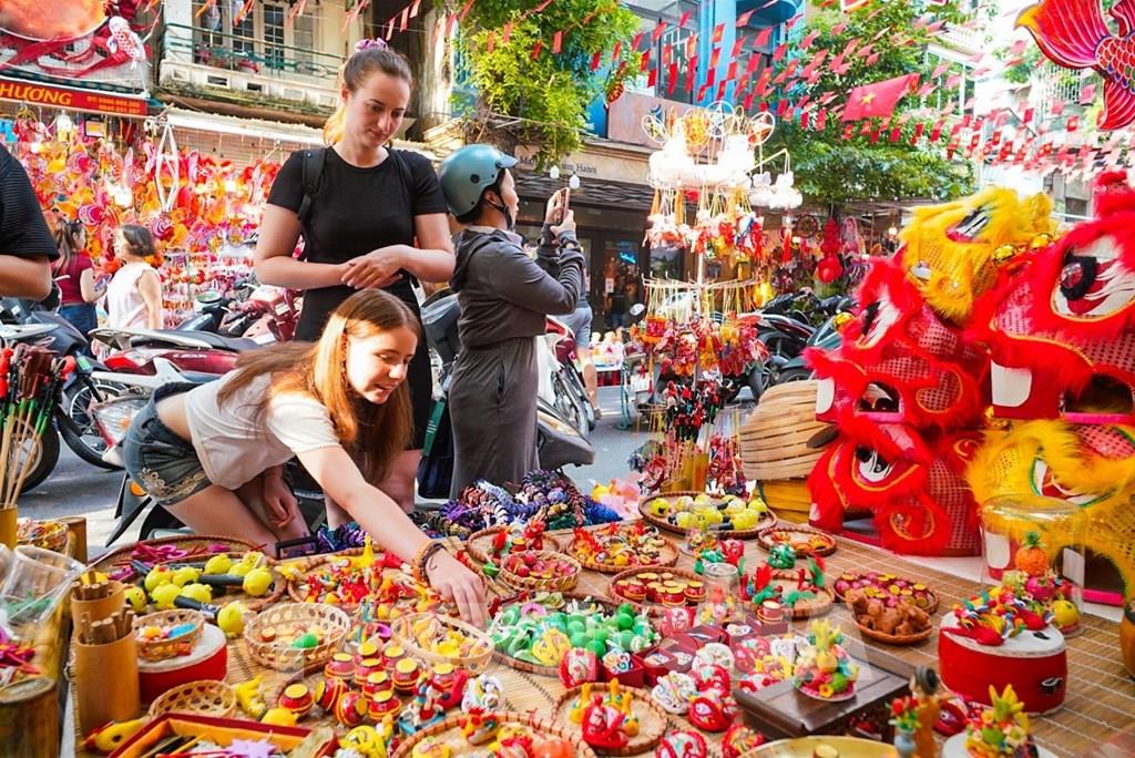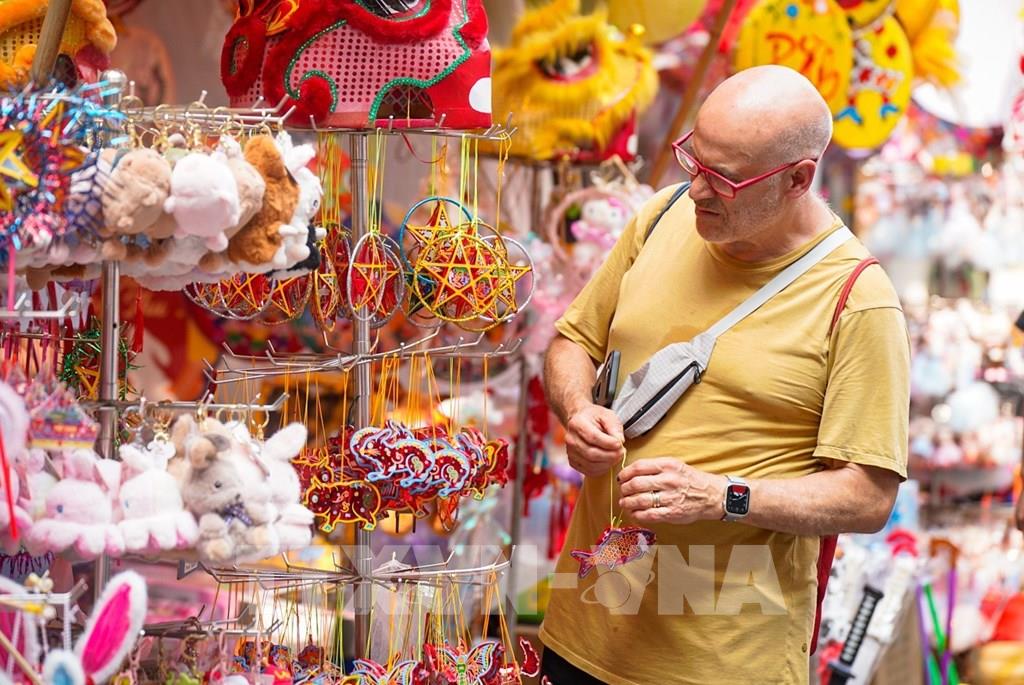 Du khách nước ngoài lựa chọn cho mình món đồ Trung thu trên phố Hàng Mã. Ảnh: Khánh Hoà - TTXVN