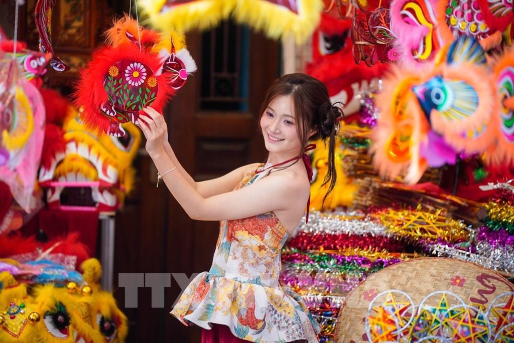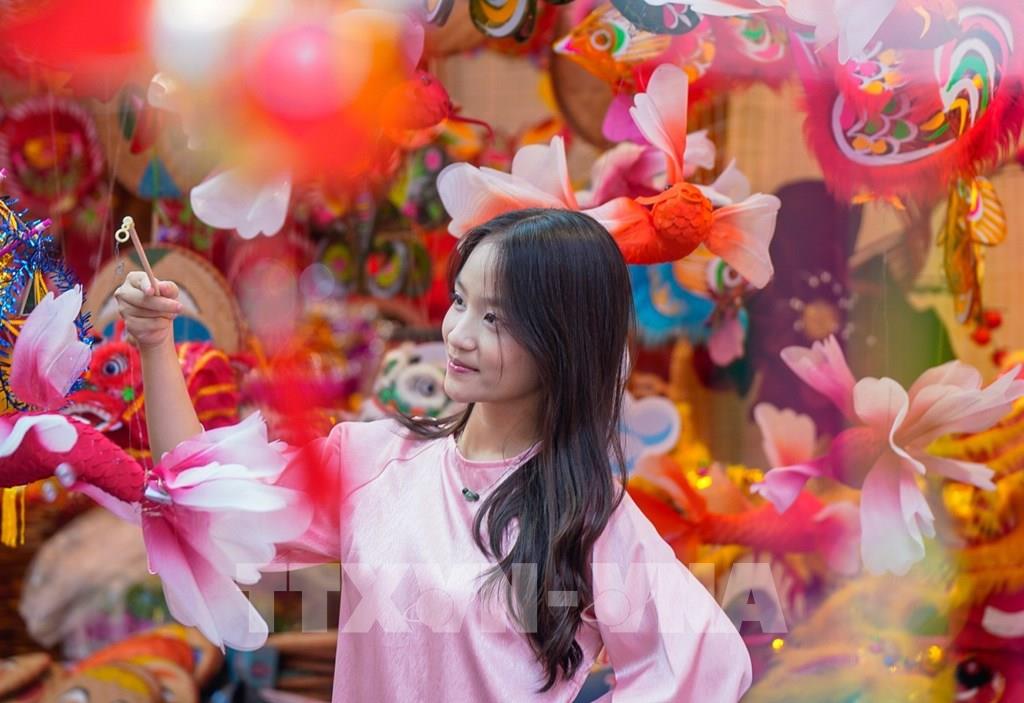 Du khách nước ngoài thích thú tìm hiểu về đồ chơi Trung thu truyền thống của Việt Nam. Ảnh: Khánh Hoà - TTXVN