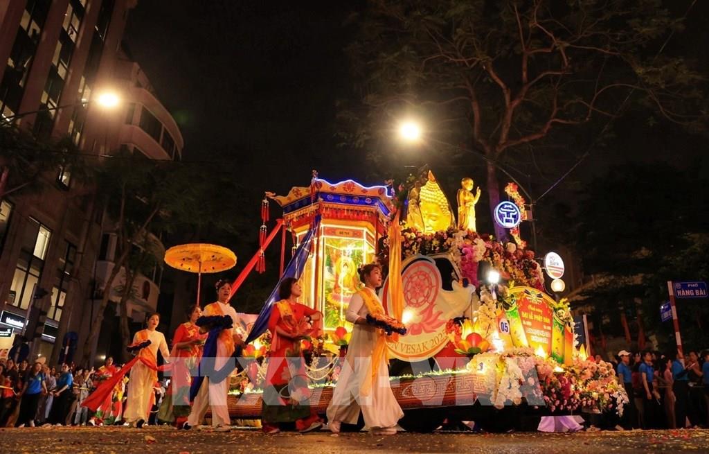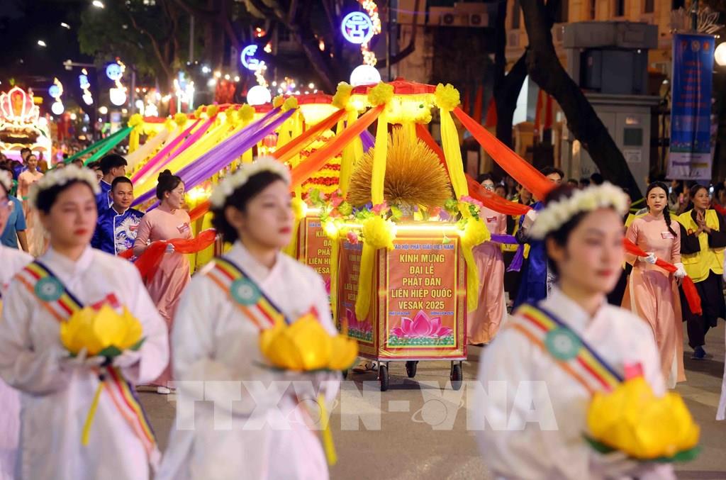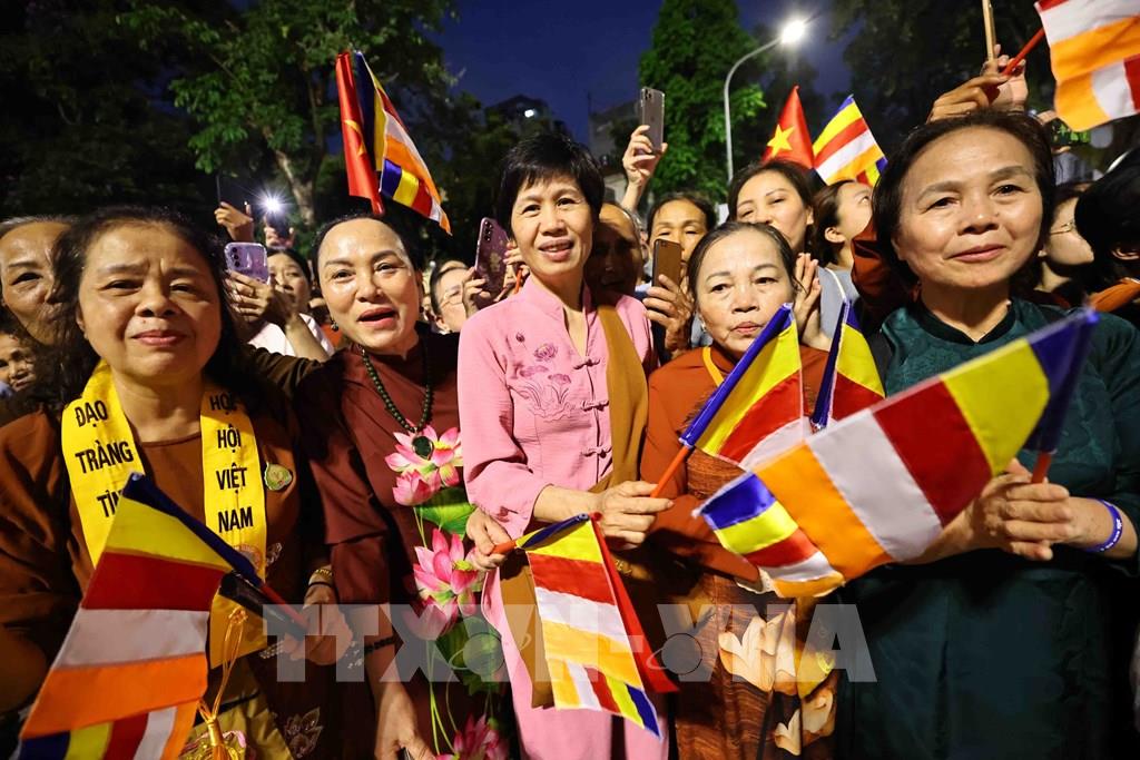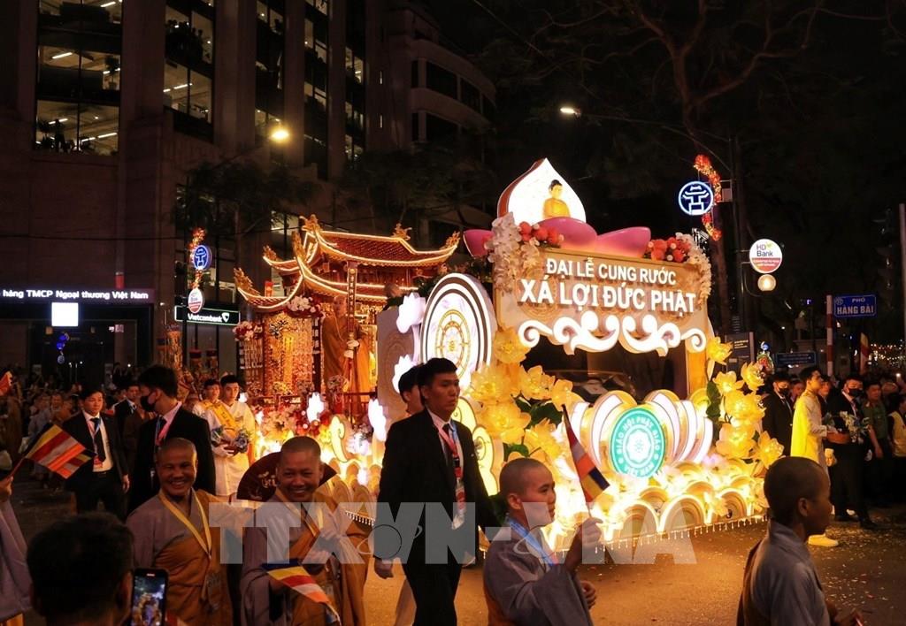 Đoàn Nghi lễ cung rước xá lợi Đức Phật đi qua tuyến phố Lý Thường Kiệt, Hoàn Kiếm, Hà Nội. Ảnh: Phạm Kiên - TTXVN