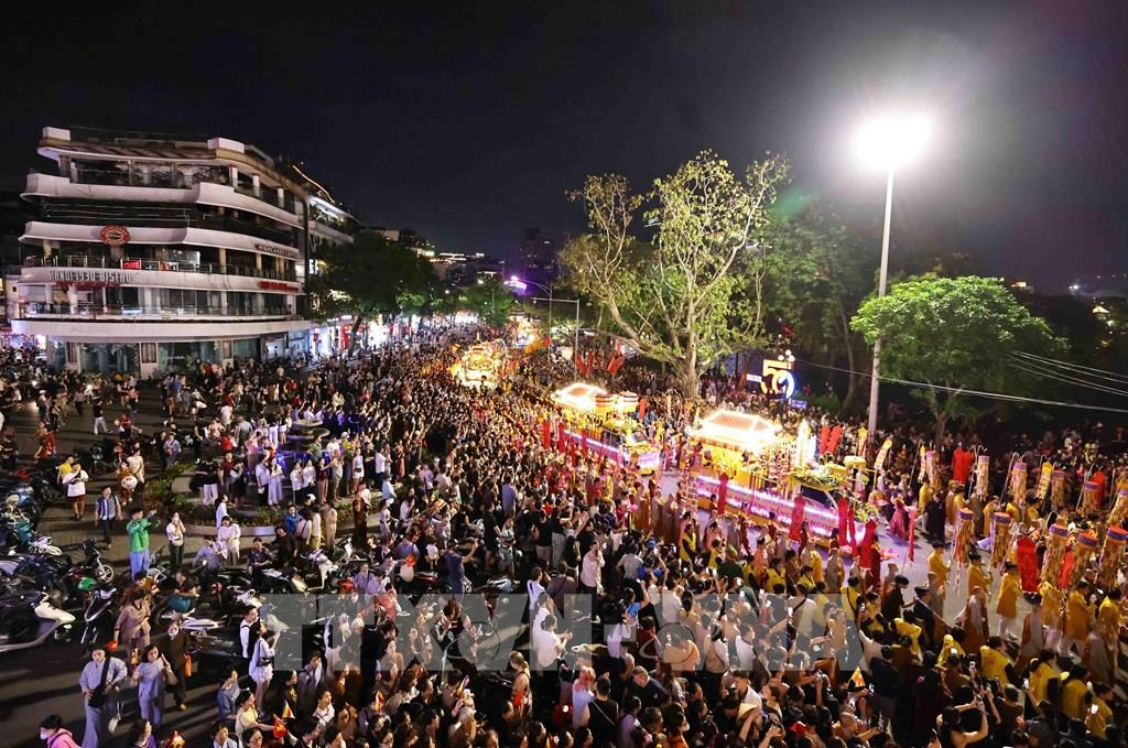 Đoàn rước đi qua phố Lý Thường Kiệt, quận Hoàn Kiếm. Ảnh: Khánh Hoà - TTXVN