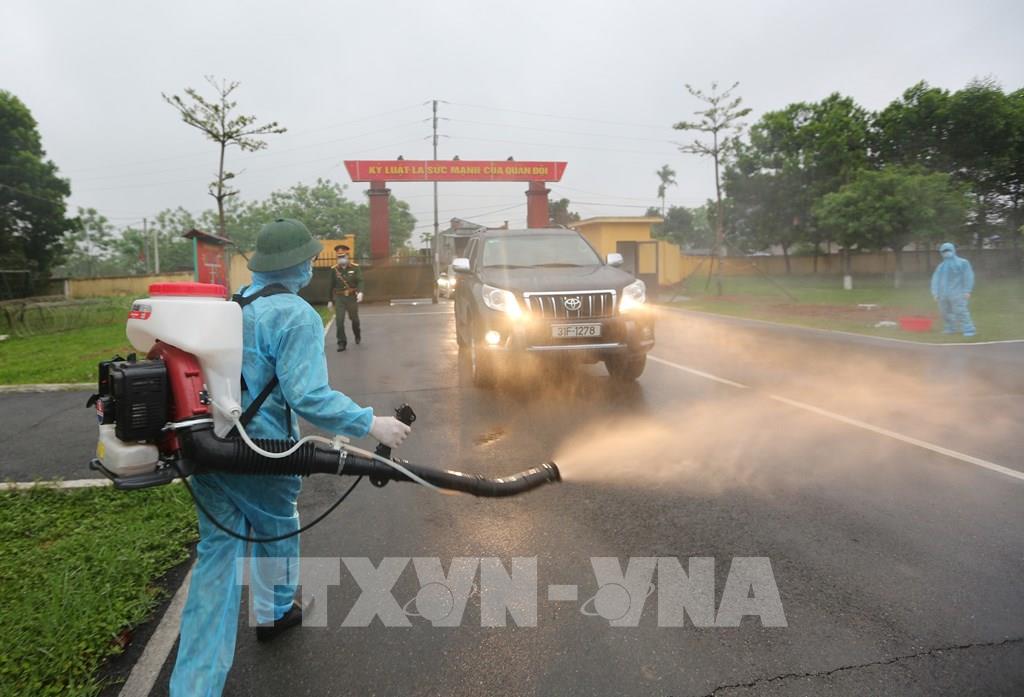 Phun hóa chất khử khuẩn phương tiện vào đón công dân hoàn thành thời gian cách ly tại Trung đoàn 58. Ảnh: Dương Giang - TTXVN