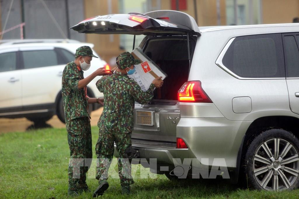 Chiến sĩ Trung đoàn 58 vận chuyển tư trang cho các công dân hoàn thành thời gian cách ly để về địa phương. Ảnh: Dương Giang - TTXVN