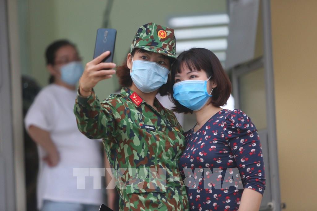 Cán bộ, chiến sĩ, quân y Trung đoàn 58 với công dân chụp ảnh lưu niệm sau khi hoàn thành thời gian cách ly. Ảnh: Dương Giang - TTXVN