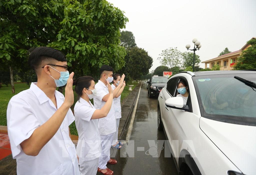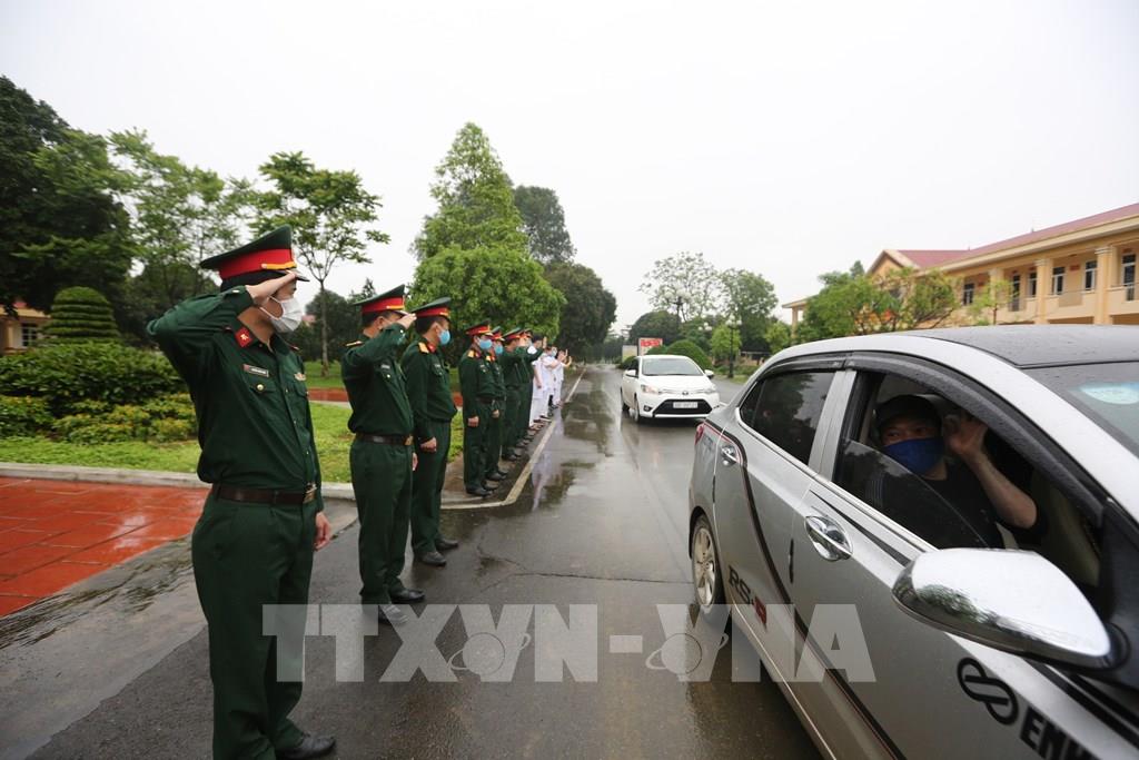 Các cán bộ, chiến sĩ quân y Trung đoàn 58 chào tạm biệt các công dân đã hoàn thành thời gian cách ly trở về địa phương. Ảnh: Dương Giang - TTXVN
