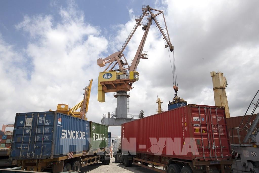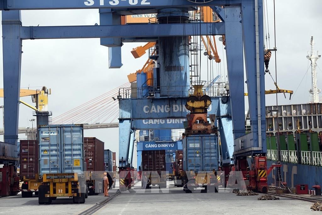 Bốc dỡ hàng tại cảng Đình Vũ. Ảnh: Tuấn Anh - TTXVN