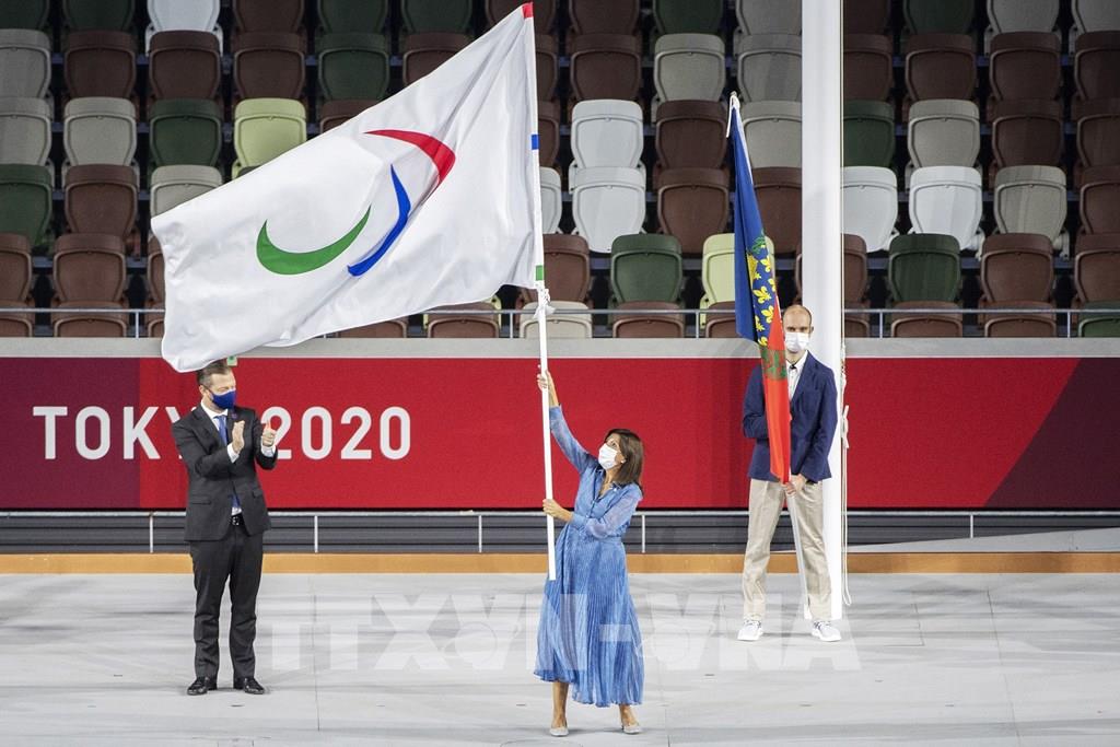 Thị trưởng Paris Anne Hidalgo (giữa) giơ cao lá cờ Paralympic tại Lễ bế mạc Paralympic Tokyo 2020 ở Tokyo, Nhật Bản, ngày 5/9/2021. Ảnh: AFP/ TTXVN