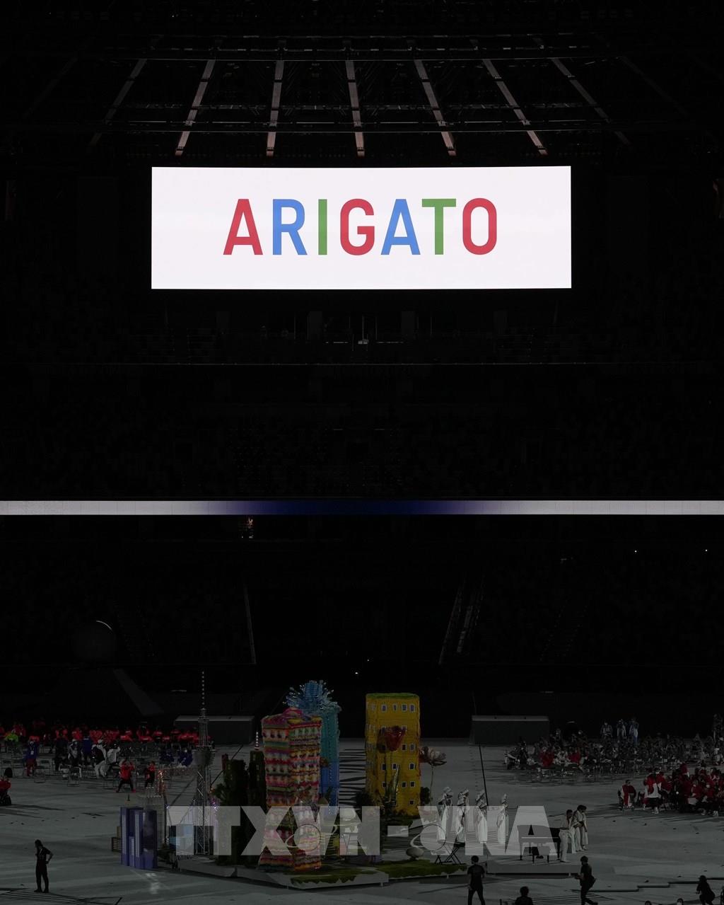 Dòng chữ "Cảm ơn" viết bằng tiếng Nhật được thắp sáng, kết thúc Lễ bế mạc Paralympic Tokyo 2020 ở Tokyo, Nhật Bản, ngày 5/9/2021. Ảnh: Kyodo/ TTXVN
