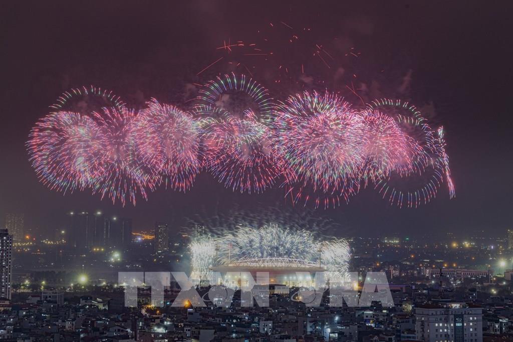 Màn pháo hoa tổng duyệt bắn pháo hoa chào mừng Đại hội đại biểu toàn quốc lần thứ XIV của Đảng. Ảnh: Lê Đông - TTXVN