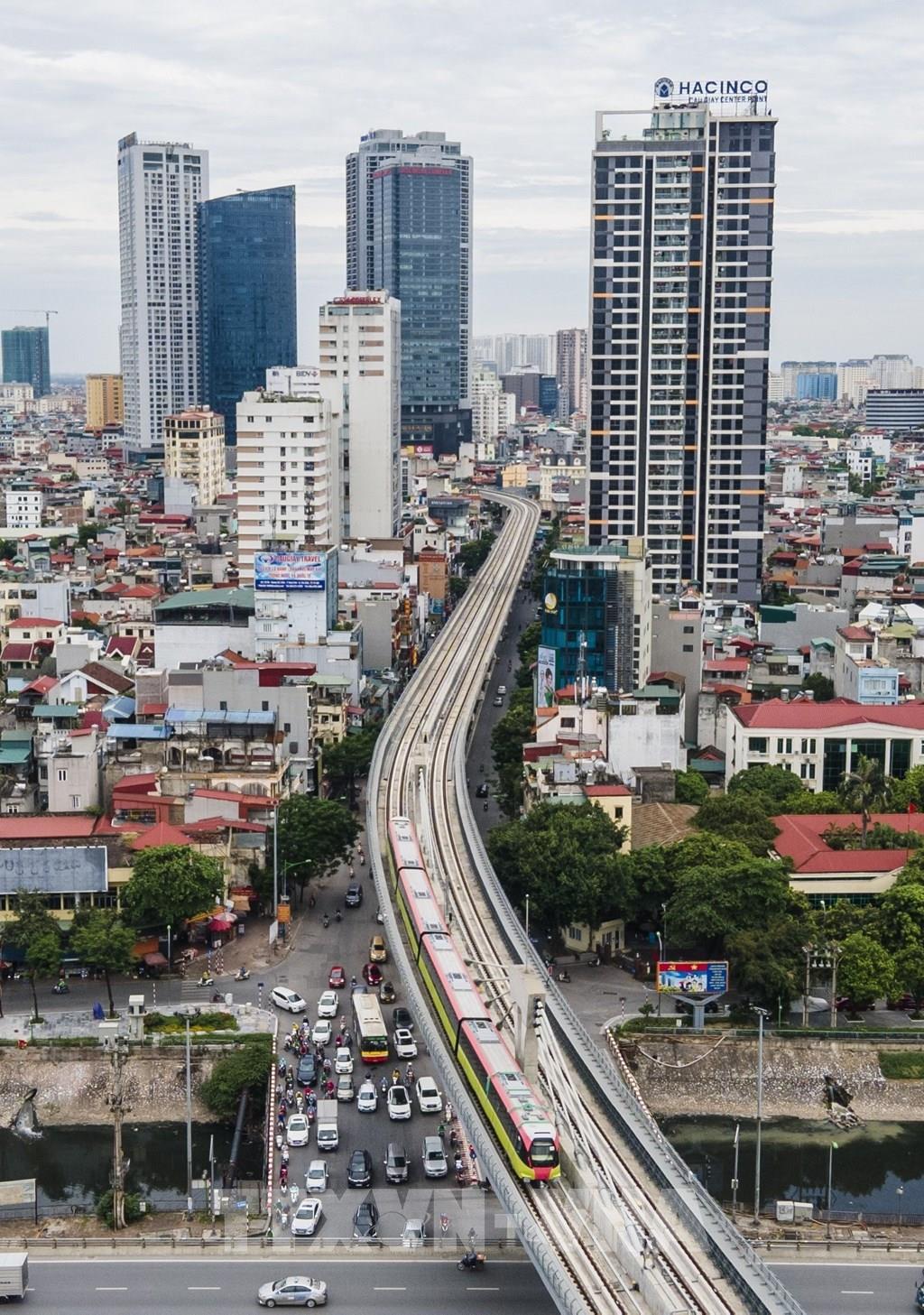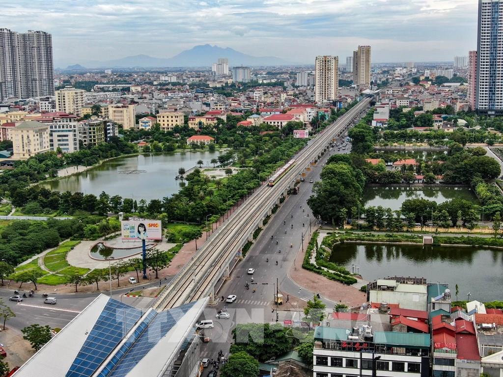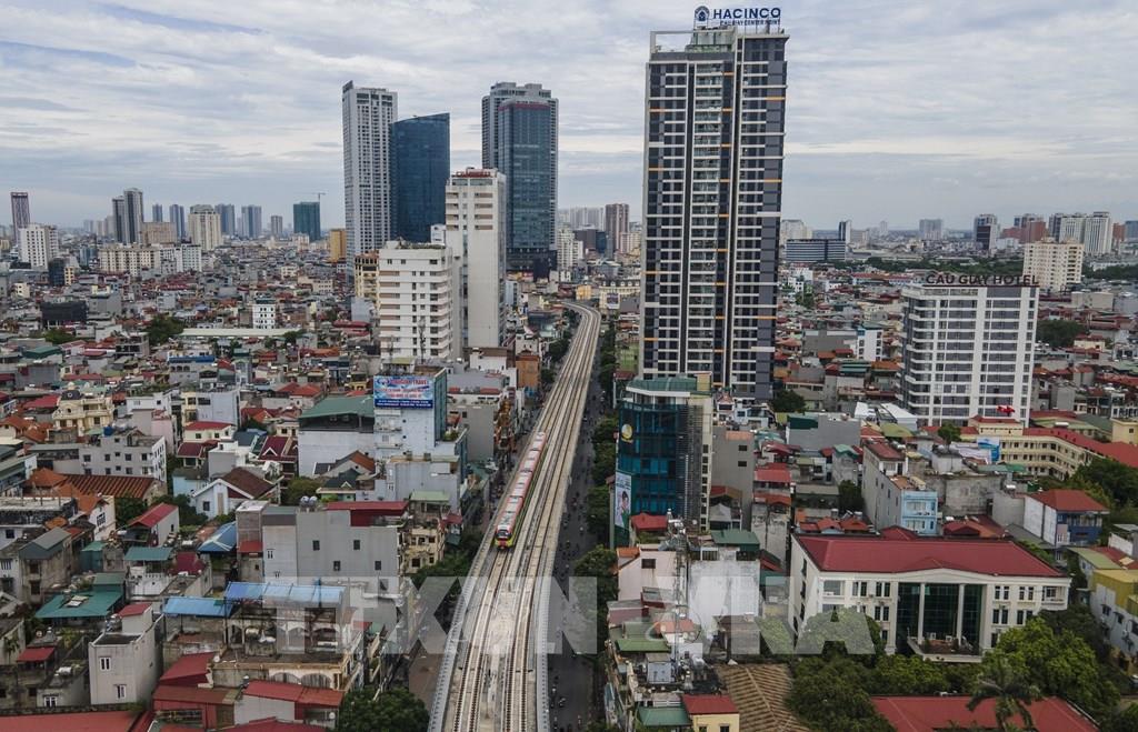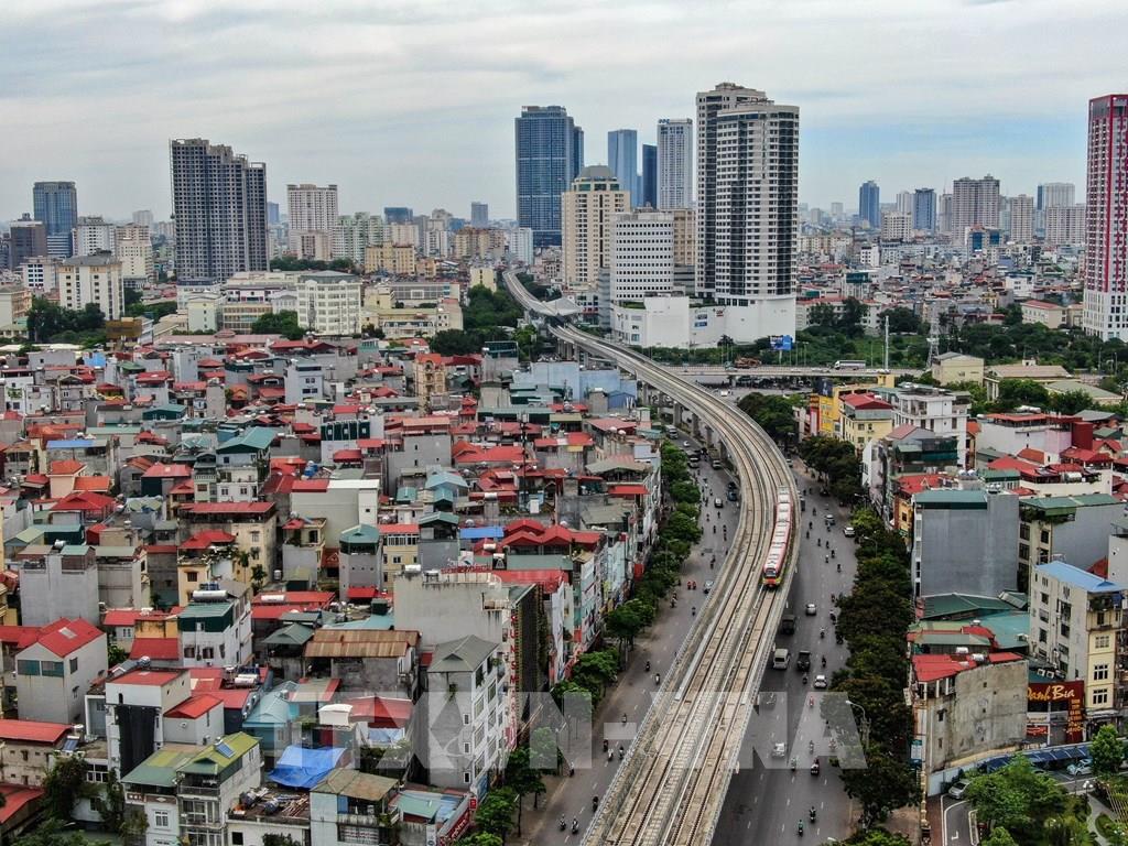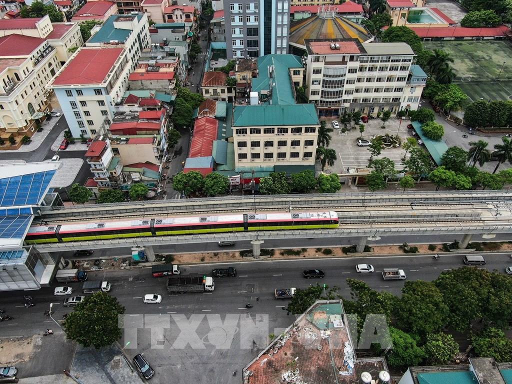 Đoàn tàu chạy qua tuyến đường Nhổn - Ga Hà Nội (đoạn trên cao dài 8,5km từ Nhổn đến Đại học Giao thông vận tải). Ảnh: Trung Nguyên - TTXVN