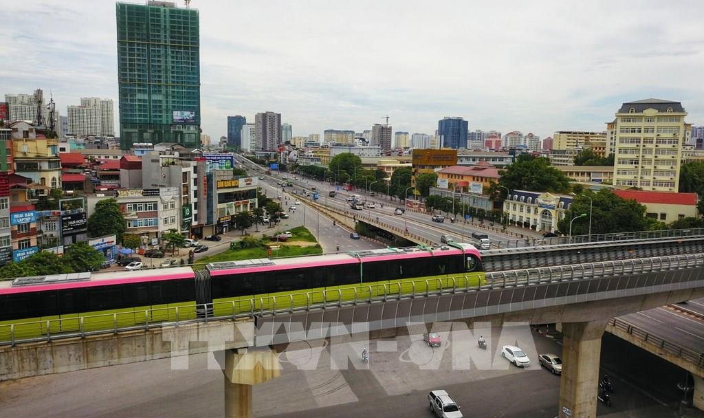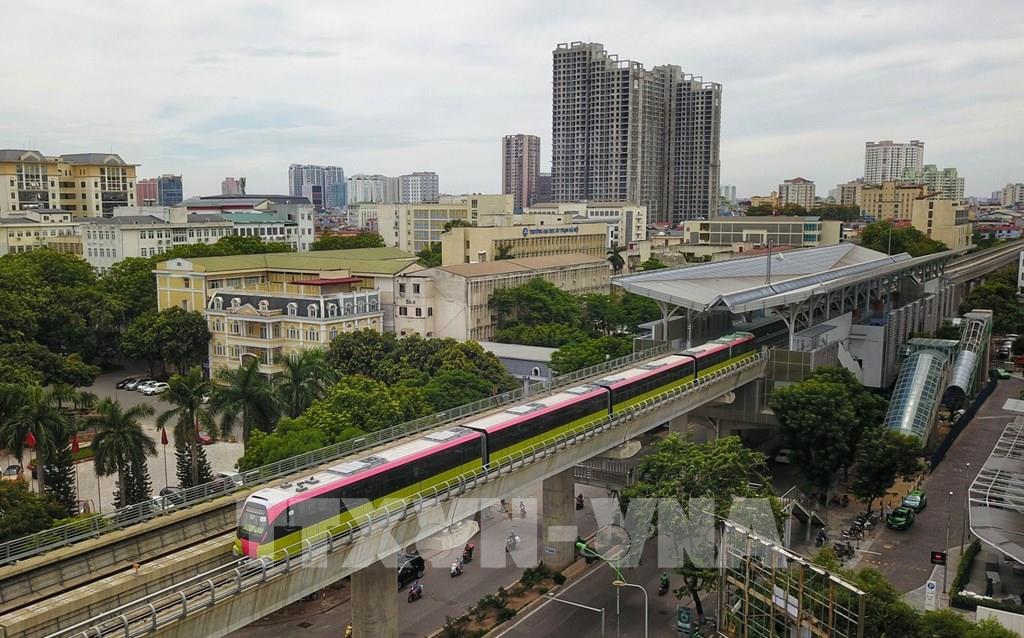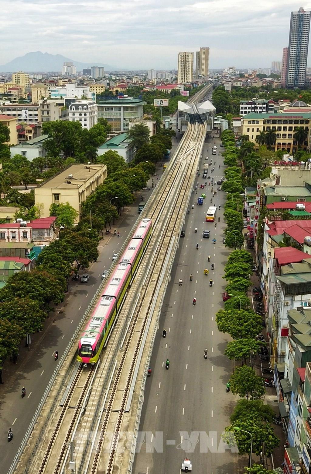 Trong ảnh: Đoàn tàu chạy qua tuyến đường Nhổn - Ga Hà Nội (đoạn trên cao dài 8,5km từ Nhổn đến Đại học Giao thông vận tải). Ảnh: Thành Đạt - TTXVN