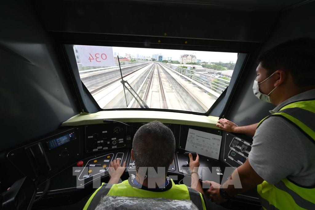 Trong ảnh: Các kỹ sư vận hành chạy thử nghiệm. Ảnh: TTXVN ; Ngày 1/7/2021, Ban quản lý đường sắt đô thị Hà Nội tiến hành chạy thử nghiệm liên động các đoàn tàu dọc tuyến đường trên cao dài 8,5km từ Depot Nhổn đến Ga S8 (Đại học Giao thông vận tải). Trong giai đoạn này các đoàn tàu sẽ được vận hành theo từng chế độ vận hành khác nhau, sau khi hoàn thành thử nghiệm liên động, dự án sẽ chuyển sang giai đoạn kiểm tra chạy thử. Ảnh: TTXVN