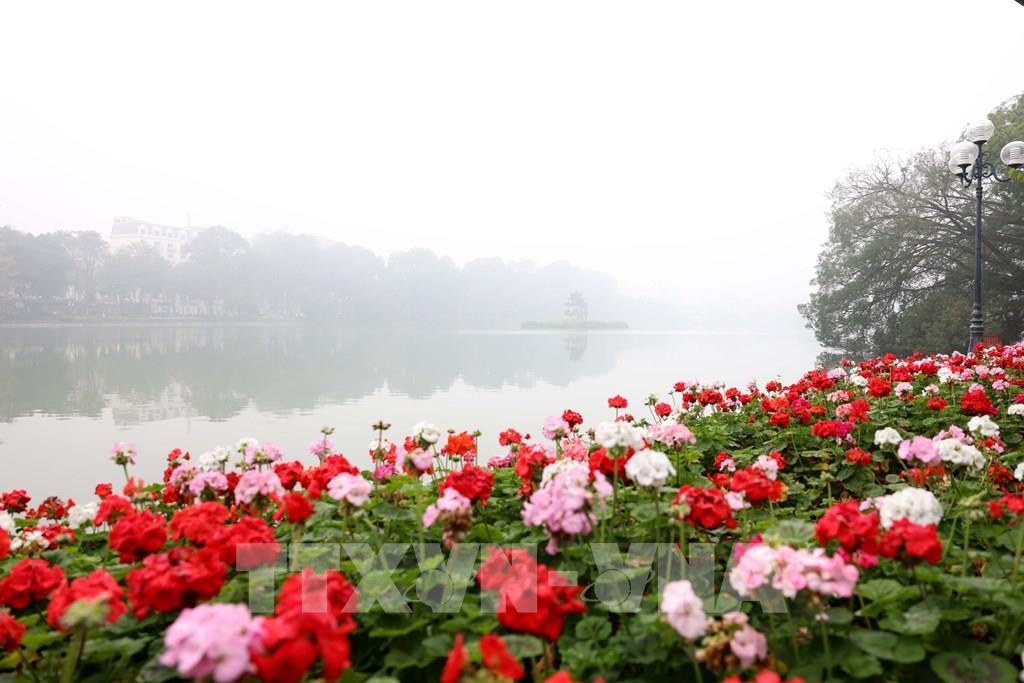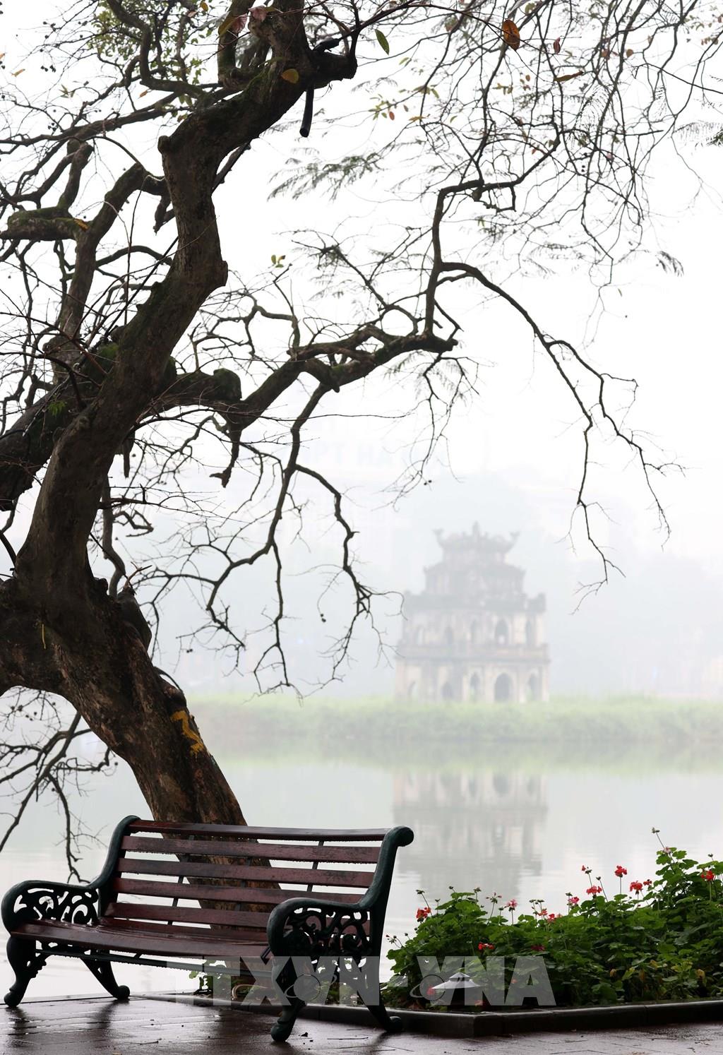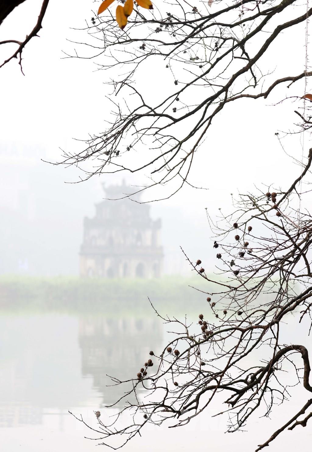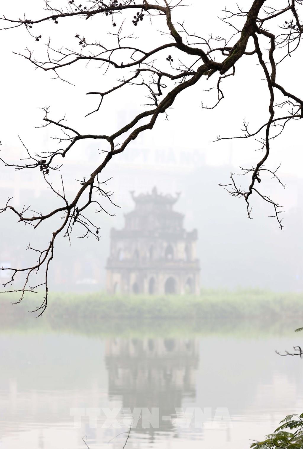 Hồ Gươm mờ ảo trong sương mù sáng tháng Ba