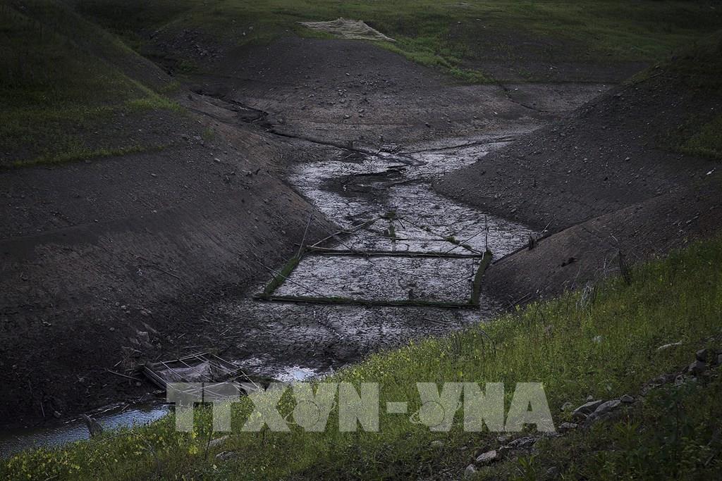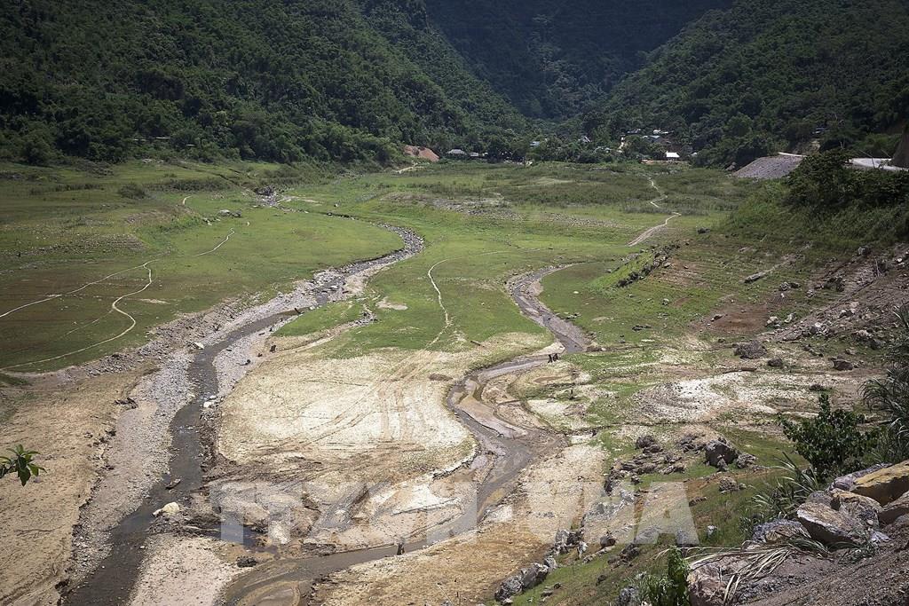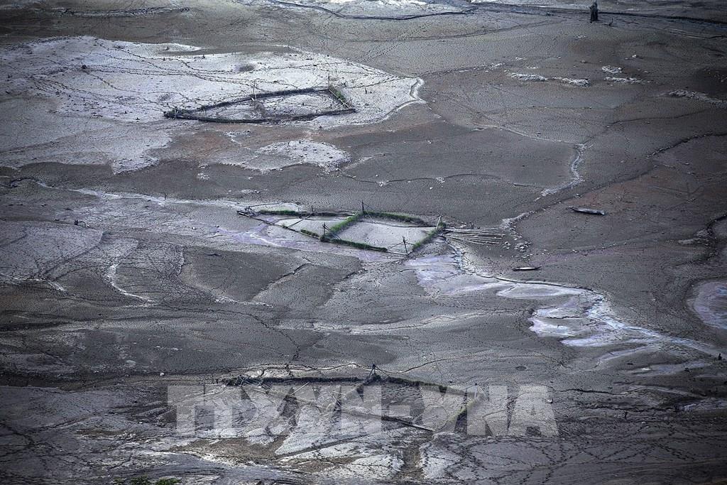 Vùng hồ bị cạn trơ đáy ngay trước các Homestay xóm Ké thuộc xã Hiền Lương, huyện Đà Bắc. Ảnh: Trọng Đạt-TTXVN
