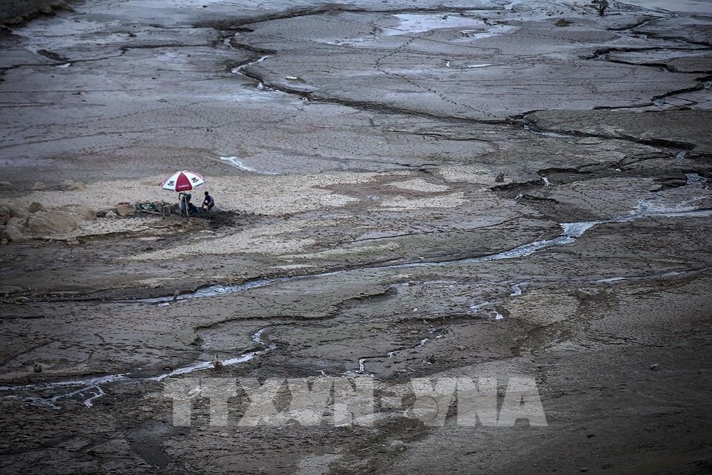 Một điểm cạn nược trơ đáy trên hồ Hòa Bình trên địa phận xã Hiền Lương, Đà Bắc. Ảnh: Trọng Đạt-TTXVN