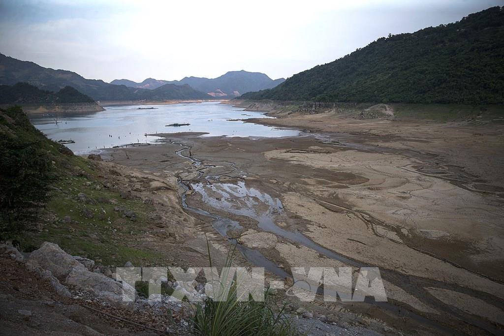 Nước vùng hồ thượng nguồn thủy điện Hòa Bình đang ở mức báo động, sụt giảm nghiêm trọng. Ảnh: Trọng Đạt-TTXVN