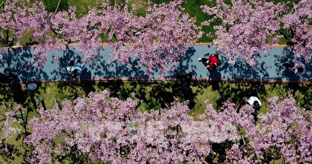 Du khách chiêm ngưỡng hoa anh đào nở rộ tại Vũ Hán, tỉnh Hồ Bắc, Trung Quốc. Ảnh: THX/ TTXVN