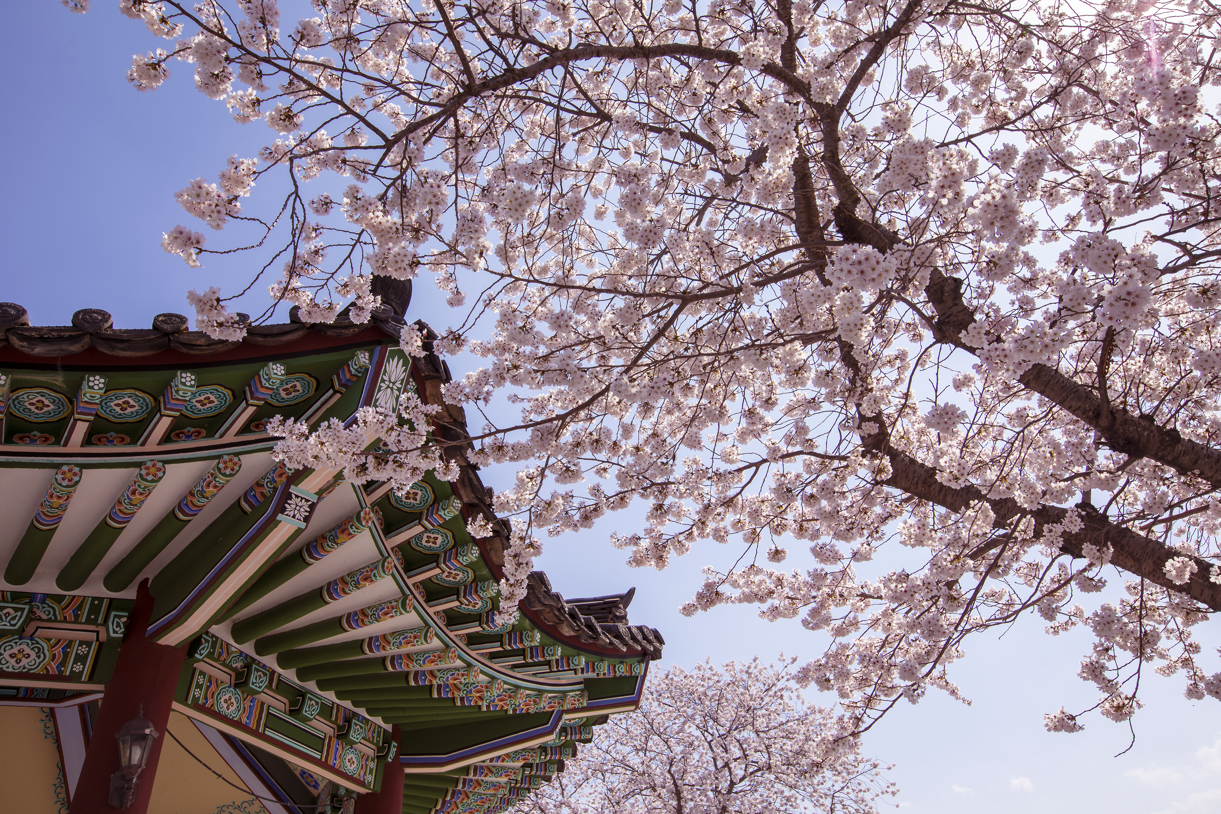 Hoa anh đào khoe sắc thắm trên kiến trúc truyền thống của Hàn Quốc. Ảnh: Anh Nguyên - PV TTXVN tại Hàn Quốc
