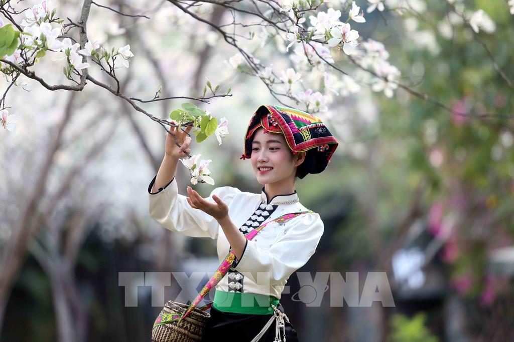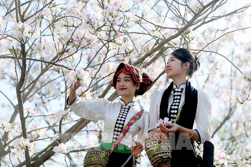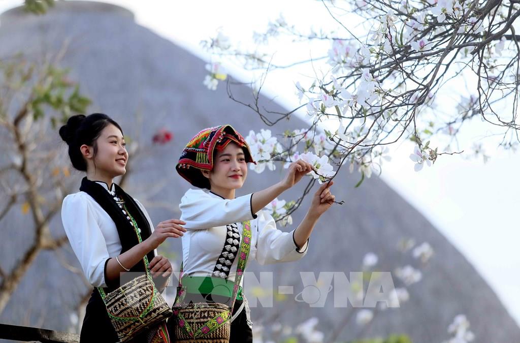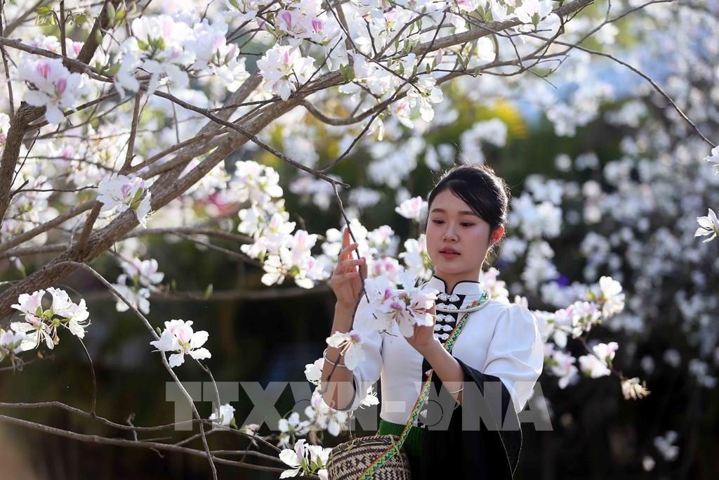 Vào mùa hoa ban nở, các bạn trẻ trong trang phục dân tộc Thái đến chiêm ngưỡng và chụp ảnh lưu niệm. Ảnh: Quang Quyết - TTXVN