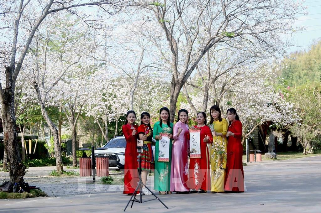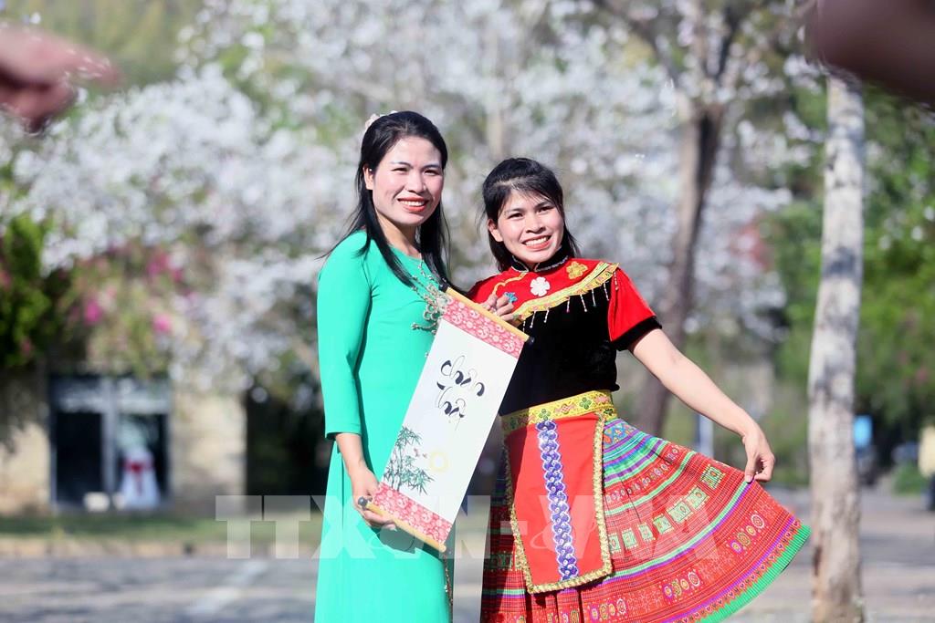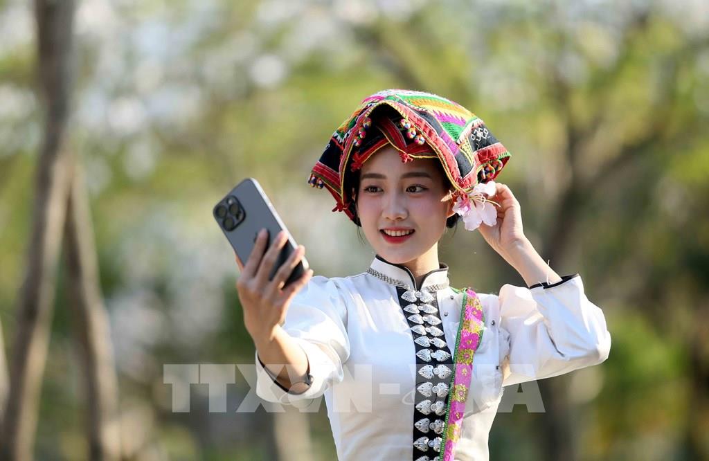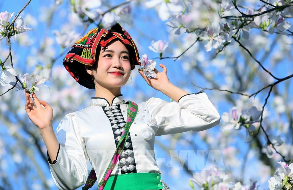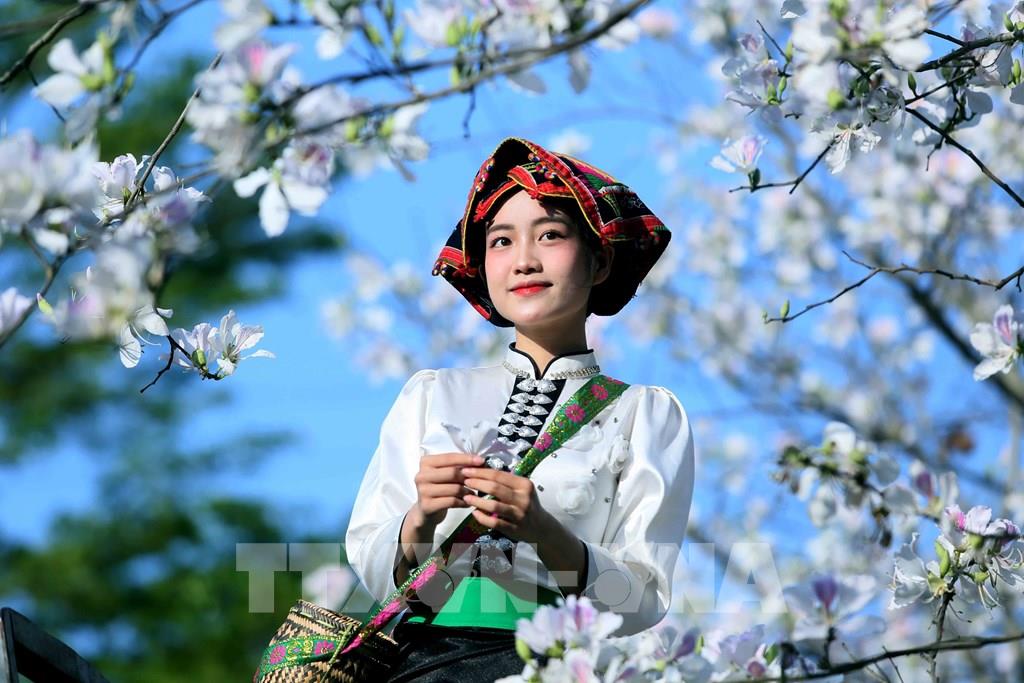 Vào mùa hoa ban nở, các bạn trẻ trong trang phục dân tộc Thái đến chiêm ngưỡng và chụp ảnh lưu niệm. Ảnh: Quang Quyết - TTXVN