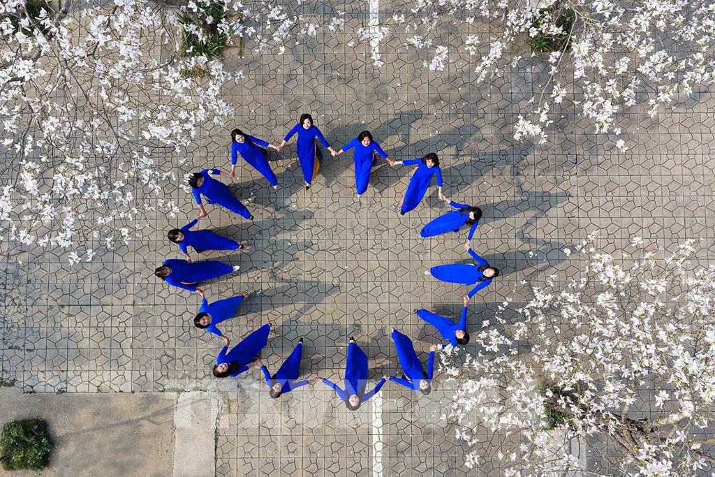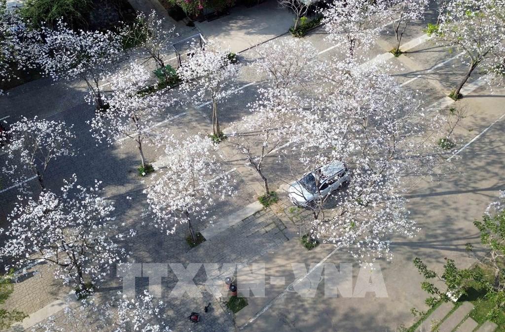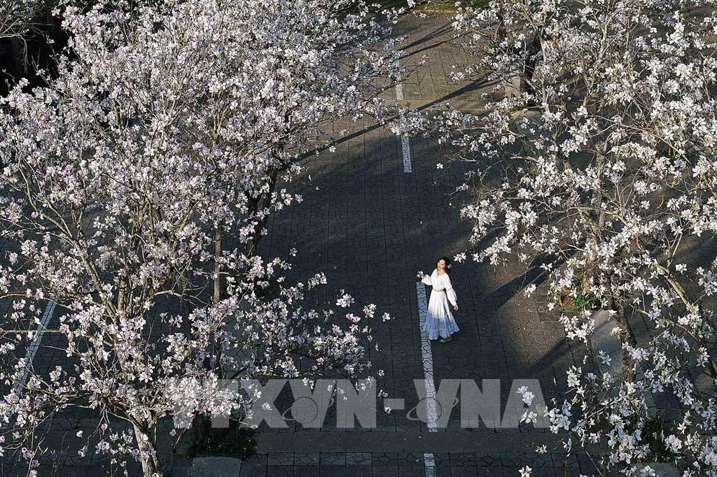 Tại quảng trường Tây Bắc, hoa ban đang bung nở trắng tinh khôi tạo khung cảnh lãng mạn, thơ mộng. Ảnh: Quang Quyết - TTXVN