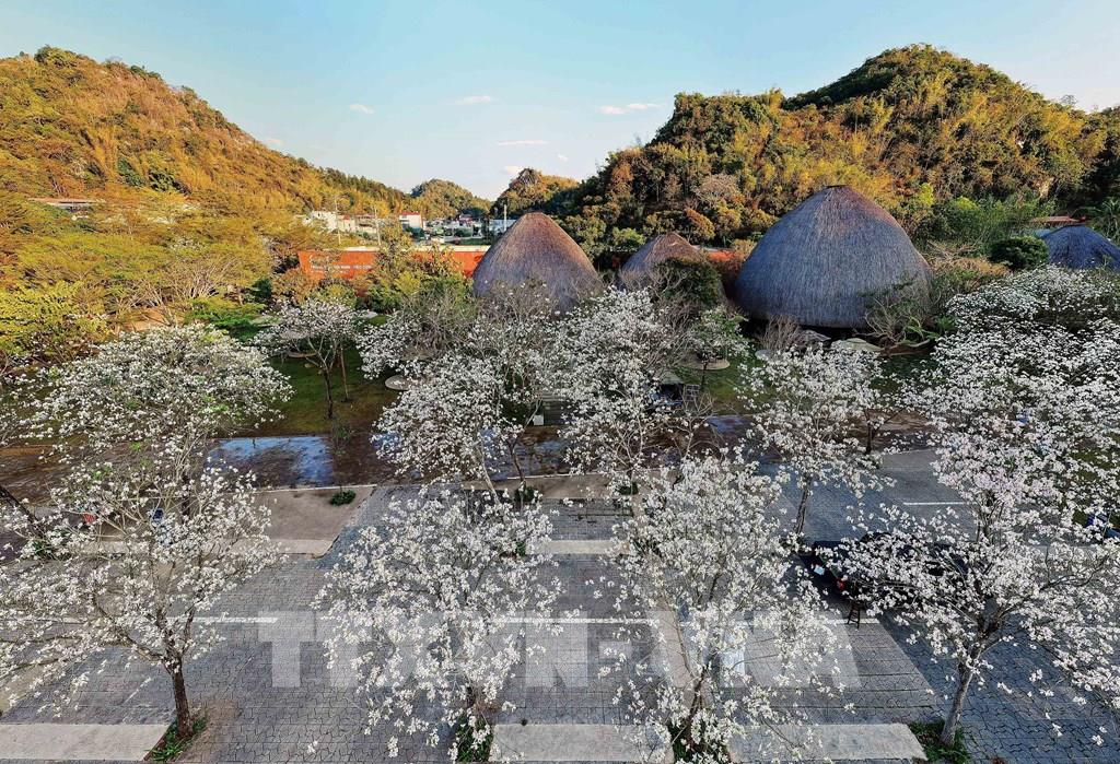 Tại khuôn viên của nhà hàng Suối Hẹn Vườn Đào, hoa ban đang bung nở trắng tinh khôi tạo khung cảnh lãng mạn, thơ mộng. Ảnh: Quang Quyết - TTXVN