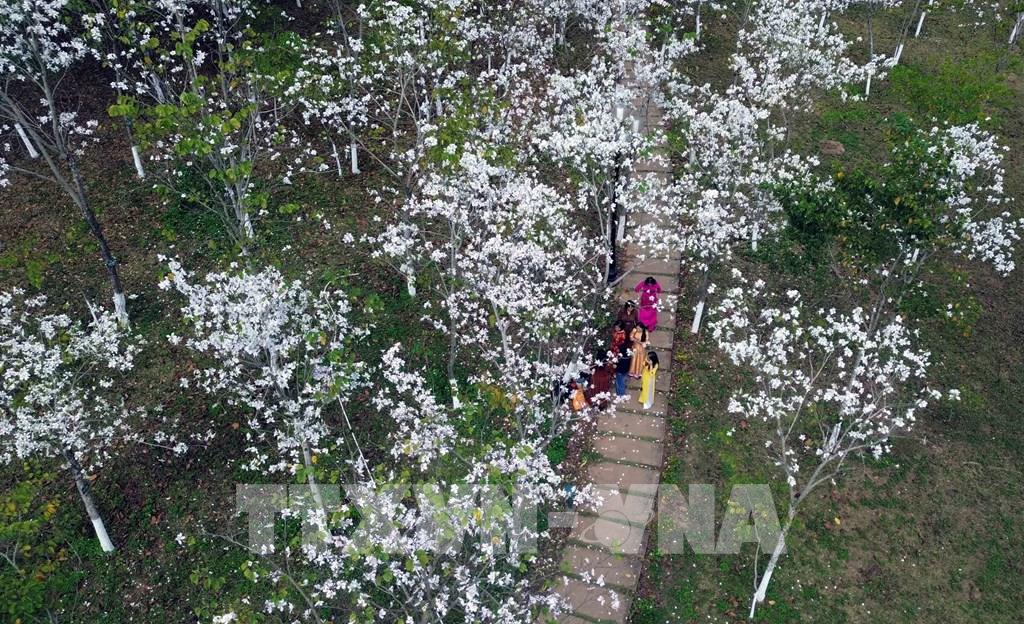 Tại khuôn viên của nhà hàng Suối Hẹn Vườn Đào, hoa ban đang bung nở trắng tinh khôi tạo khung cảnh lãng mạn, thơ mộng, thu hút đông đảo nhân dân và du khách đến tham quan, chụp ảnh. Ảnh: Quang Quyết - TTXVN