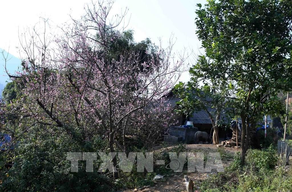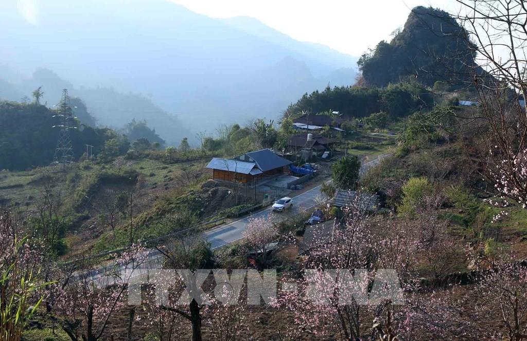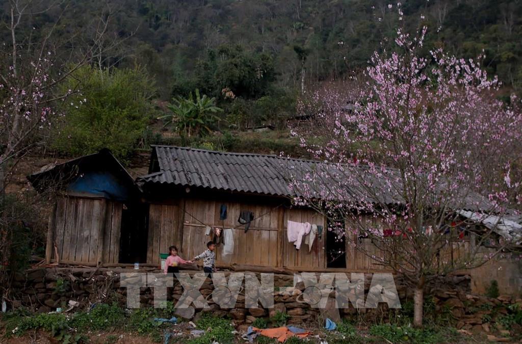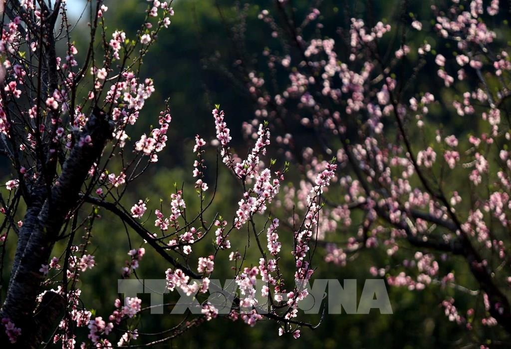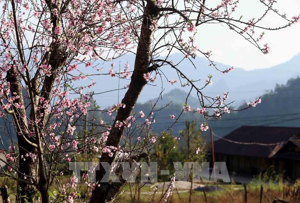 Những cây hoa đào nở rực rỡ đã tạo nên bức tranh thanh bình nơi rẻo cao Tây Bắc. Ảnh: Quý Trung - TTXVN