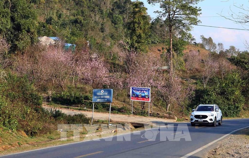 Dọc tuyến đường đi huyện biên giới Phong Thổ, hàng trăm cây hoa đào bung nở rực rỡ. Ảnh: Quý Trung – TTXVN