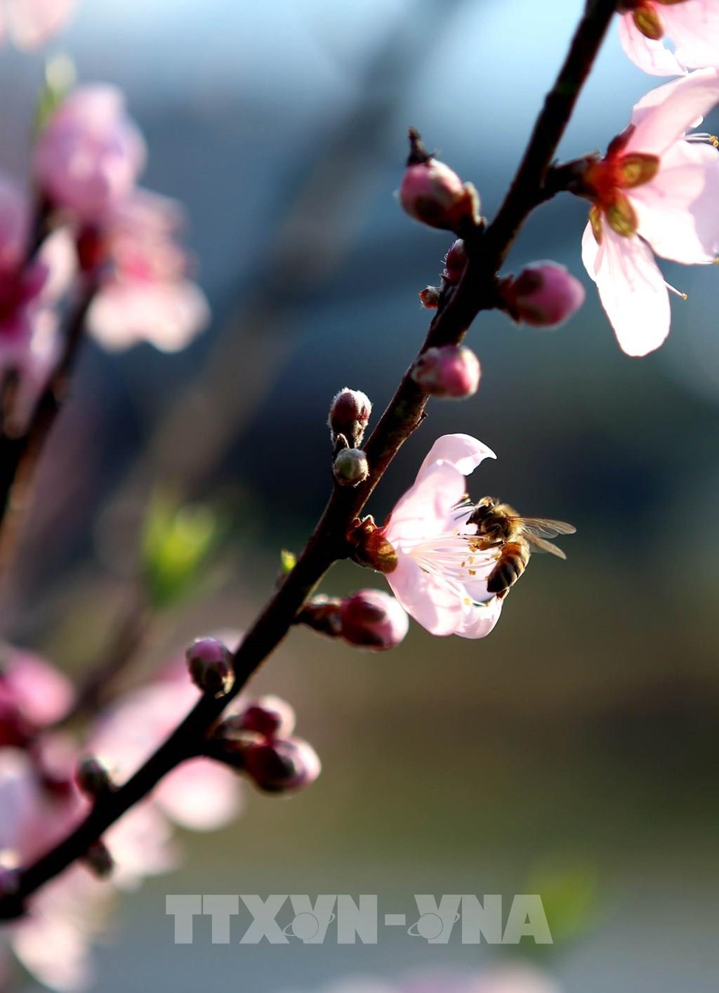 Ánh nắng chiều càng tô thêm sắc thắm của hoa đào tạo ra khung cảnh lung linh. Ảnh: Quý Trung - TTXVN