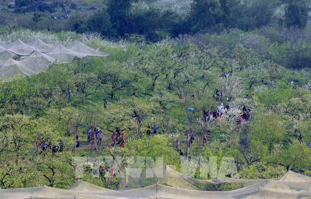 Khách đến tham quan, trải nghiệm tại vườn mận của gia đình anh Giàng A Sáng tại thung lũng Nà Ka, huyện Mộc Châu. Ảnh: Quang Quyết – TTXVN