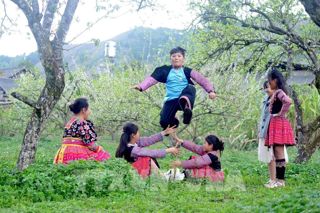 Các em nhỏ dân tộc Mông ở bản Tà Phềnh, xã Tân Lập, huyện Mộc Châu vui chơi tại vườn mận của gia đình. Ảnh: Quang Quyết – TTXVN