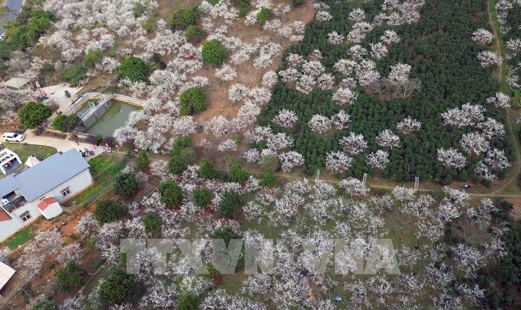 Tại thành phố Sơn La, khắp các triền đồi phủ kín sắc trắng của hoa mận, thu hút đông đảo du khách trong và ngoài tỉnh, nhân dân đến tham quan, trải nghiệm. Ảnh: Quang Quyết – TTXVN