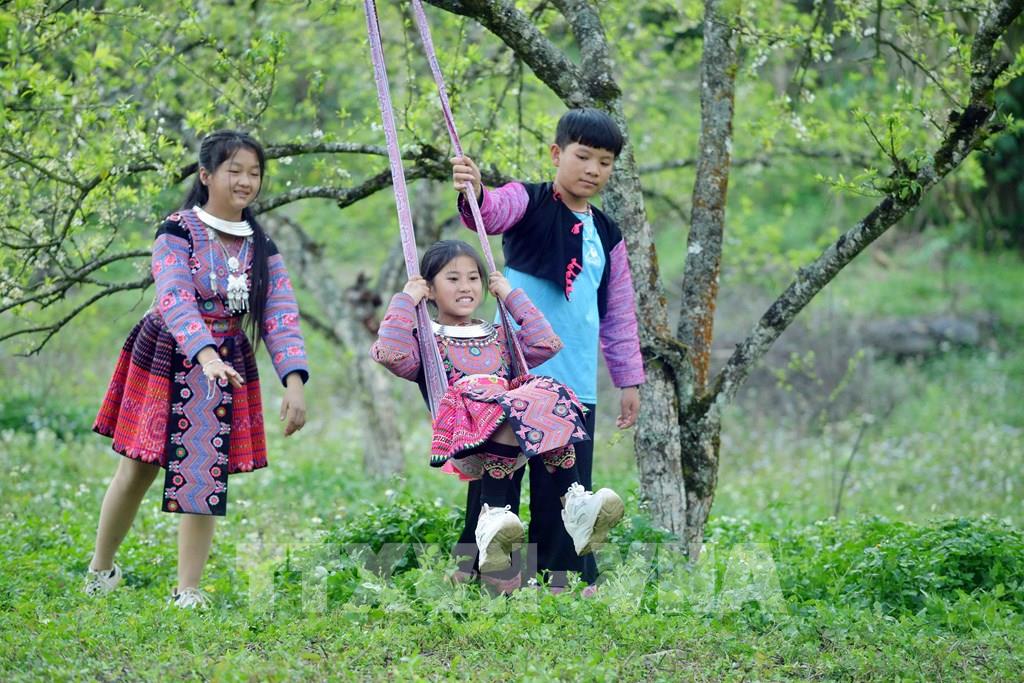 Các em nhỏ dân tộc Mông ở bản Tà Phềnh, xã Tân Lập, huyện Mộc Châu, vui chơi tại vườn mận của gia đình. Ảnh: Quang Quyết – TTXVN