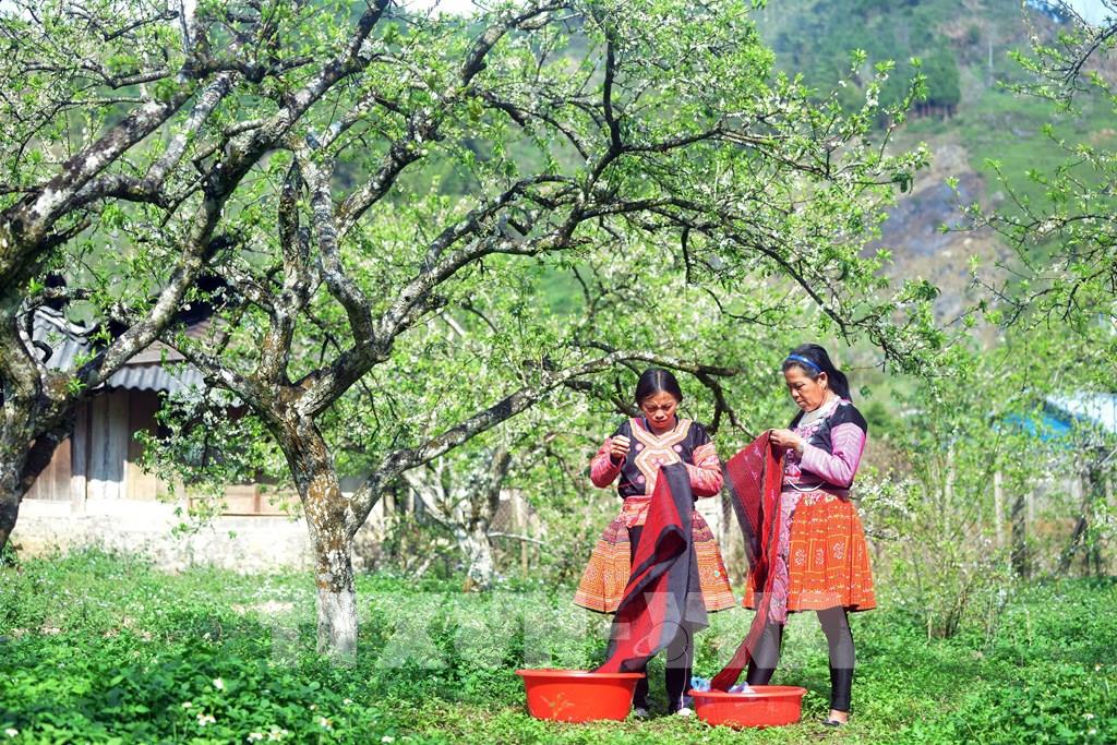 Phụ nữ dân tộc Mông ở bản Tà Phềnh, xã Tân Lập, huyện Mộc Châu thêu trang phục truyền thống bên vườn mận của gia đình. Ảnh: Quang Quyết – TTXVN
