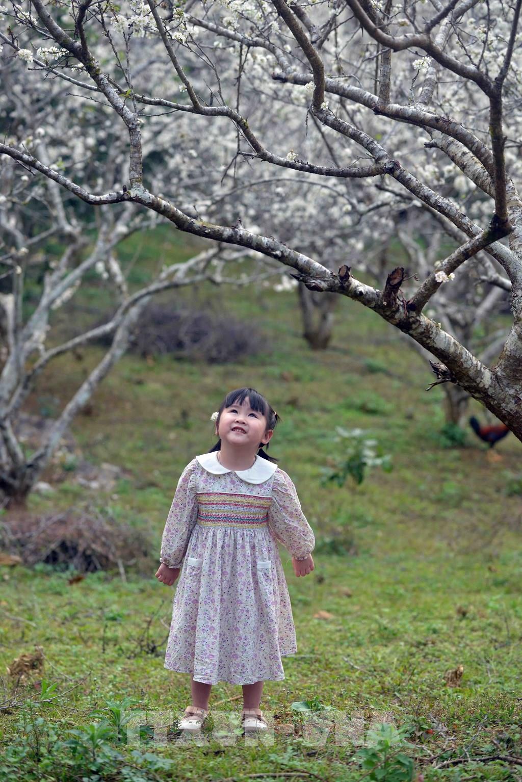 Các em nhỏ vô cùng thích thú khi được ngắm và chụp ảnh tại vườn mận mỗi dịp hoa nở rộ. Ảnh: Quang Quyết – TTXVN
