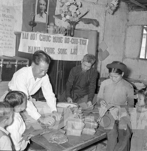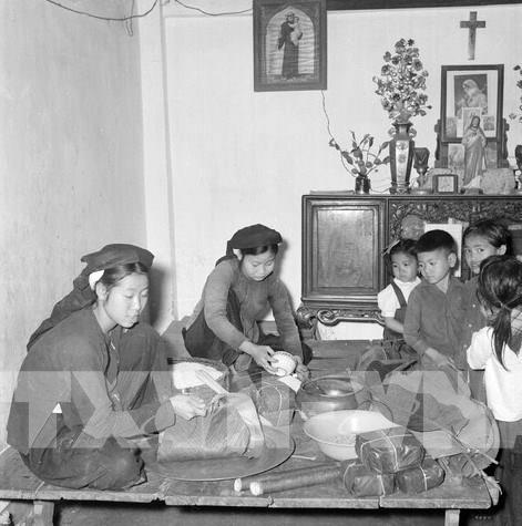 Một gia đình lao động tại khu Phúc Xá (nay là phường Phúc Xá, Quận Ba Đình) gói bánh chưng Tết. Ảnh: TTXVN