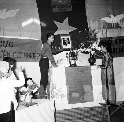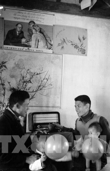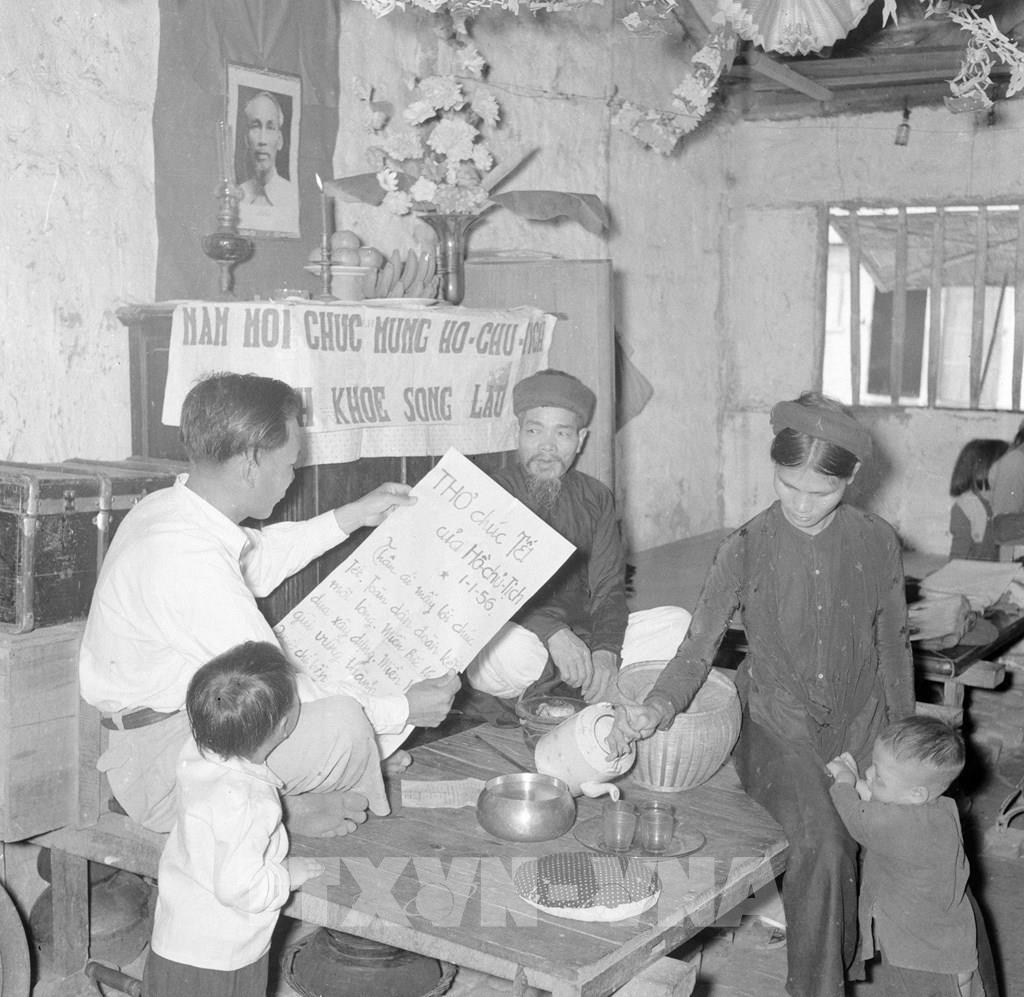 Sáng mồng một Tết, cả gia đình ngồi trước bàn thờ Tổ quốc nghe đọc thư chúc Tết của Hồ Chủ tịch trong dịp đầu năm. Ảnh: TTXVN