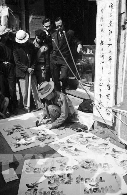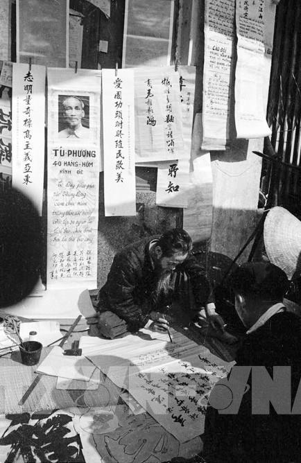 Viết câu đối, thơ và khẩu hiệu trong Tết Nguyên đán trở thành nét văn hoá truyền thống của người Hà Nội. Ảnh: TTXVN