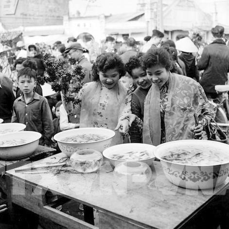 Thiếu nữ Thủ đô đi chọn cá chuẩn bị cho ngày ông Công, ông Táo. Ảnh: TTXVN
