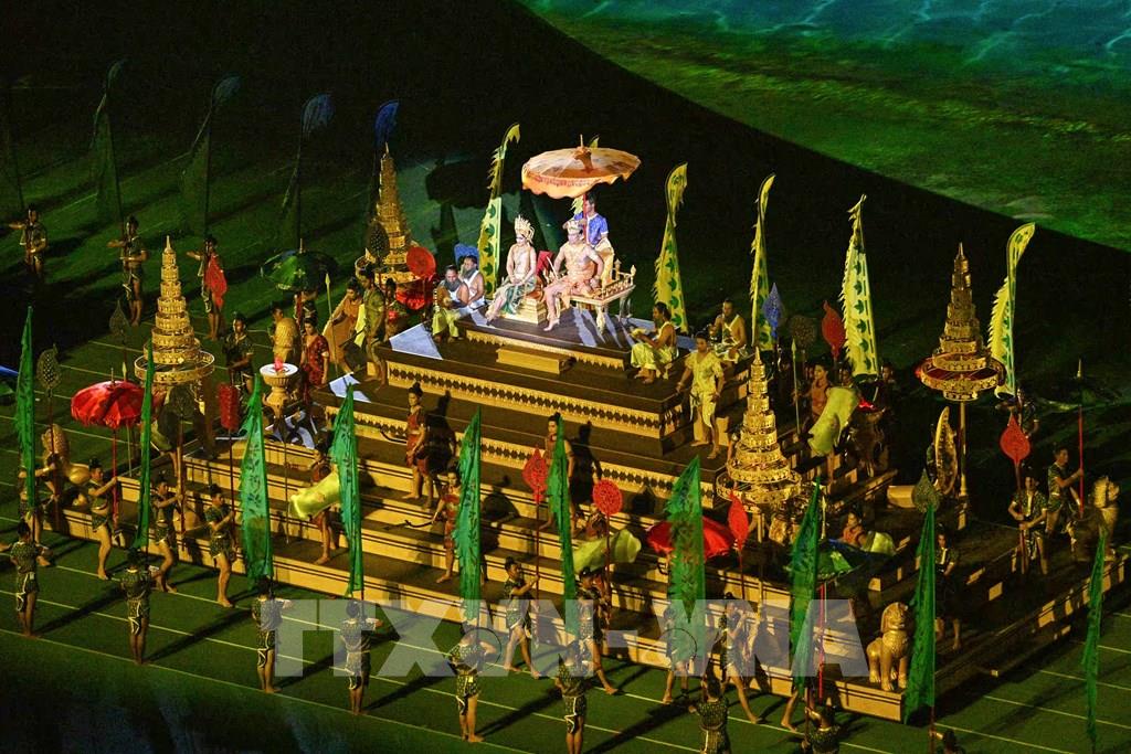 Tiết mục biểu diễn thuộc chương hai "Nụ cười của người Khmer" tại Lễ khai mạc SEA Games 32. Ảnh: AFP/TTXVN