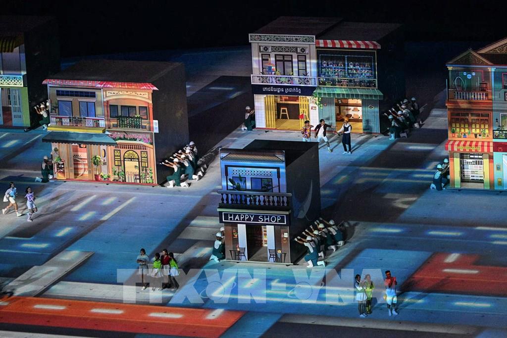 Màn biểu diễn nghệ thuật tại Lễ khai mạc SEA Games 32 trên sân vận động Morodok Techo, thủ đô Phnom Penh, Campuchia. Ảnh: AFP/TTXVN
