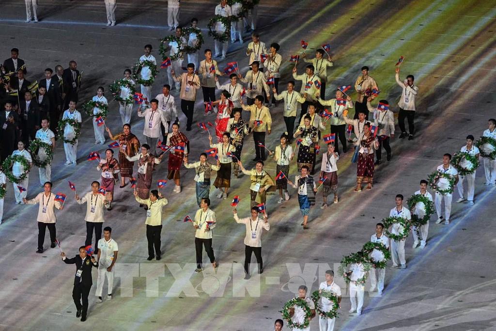 Đoàn thể thao Lào diễu hành trên sân vận động Morodok Techo trong Lễ khai mạc SEA Games 32. Ảnh: AFP/TTXVN
