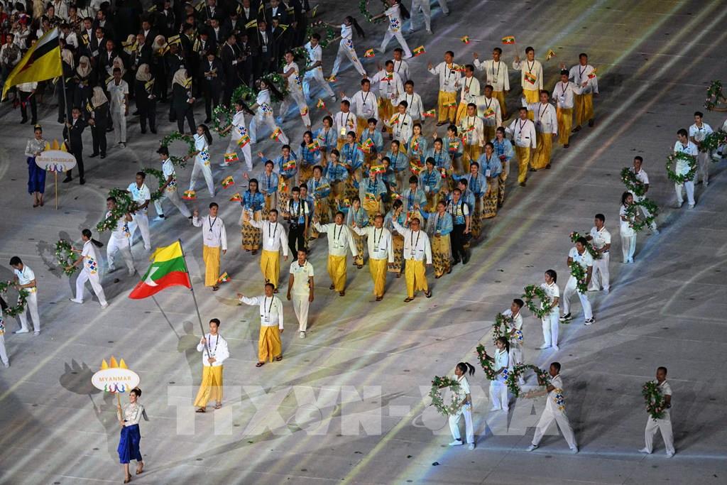 Đoàn thể thao Myanmar diễu hành trên sân vận động Morodok Techo trong Lễ khai mạc SEA Games 32. Ảnh: AFP/TTXVN